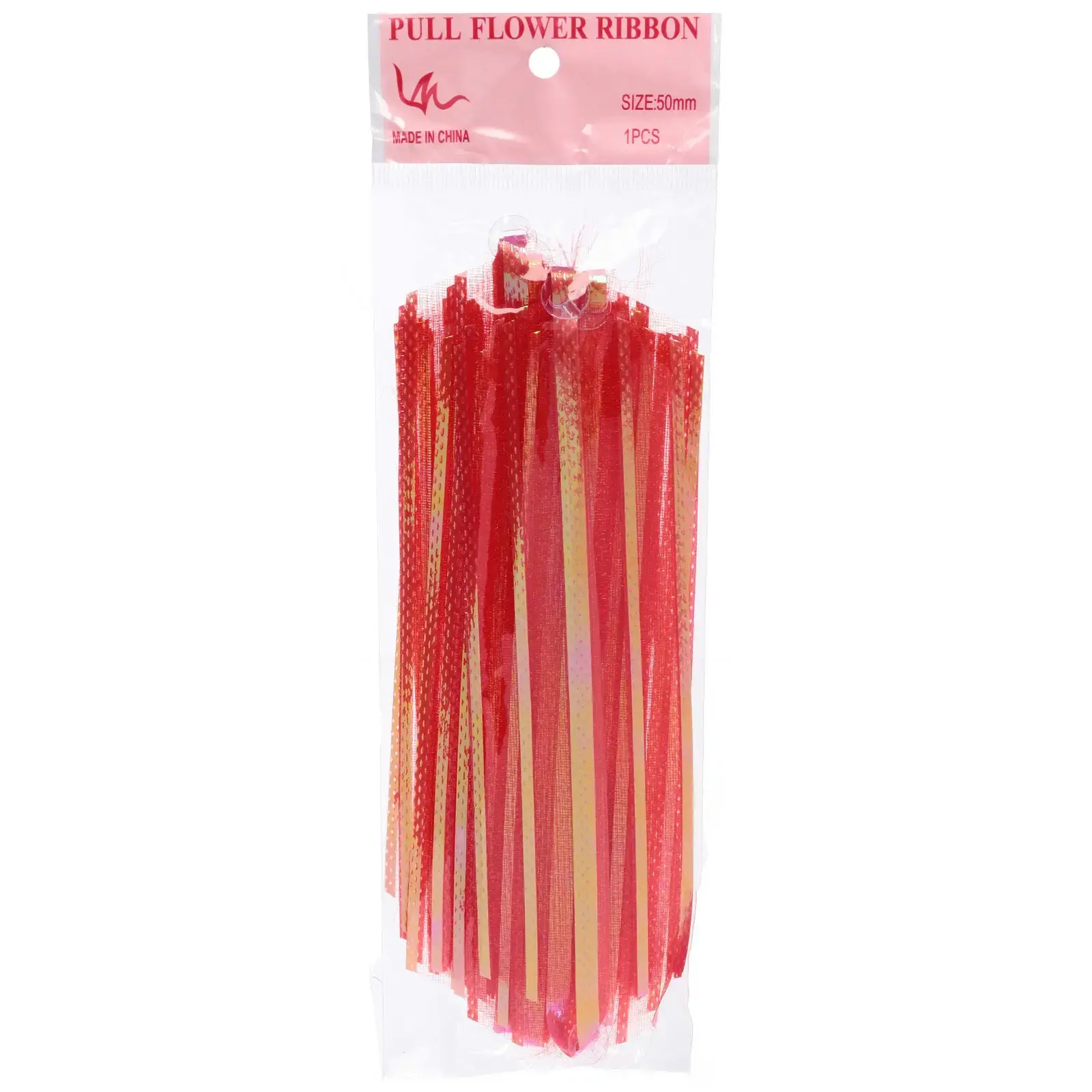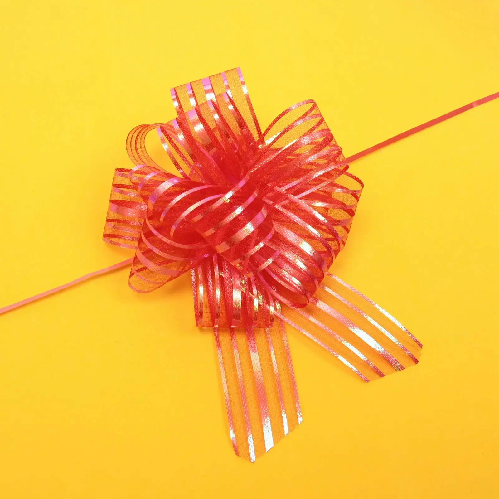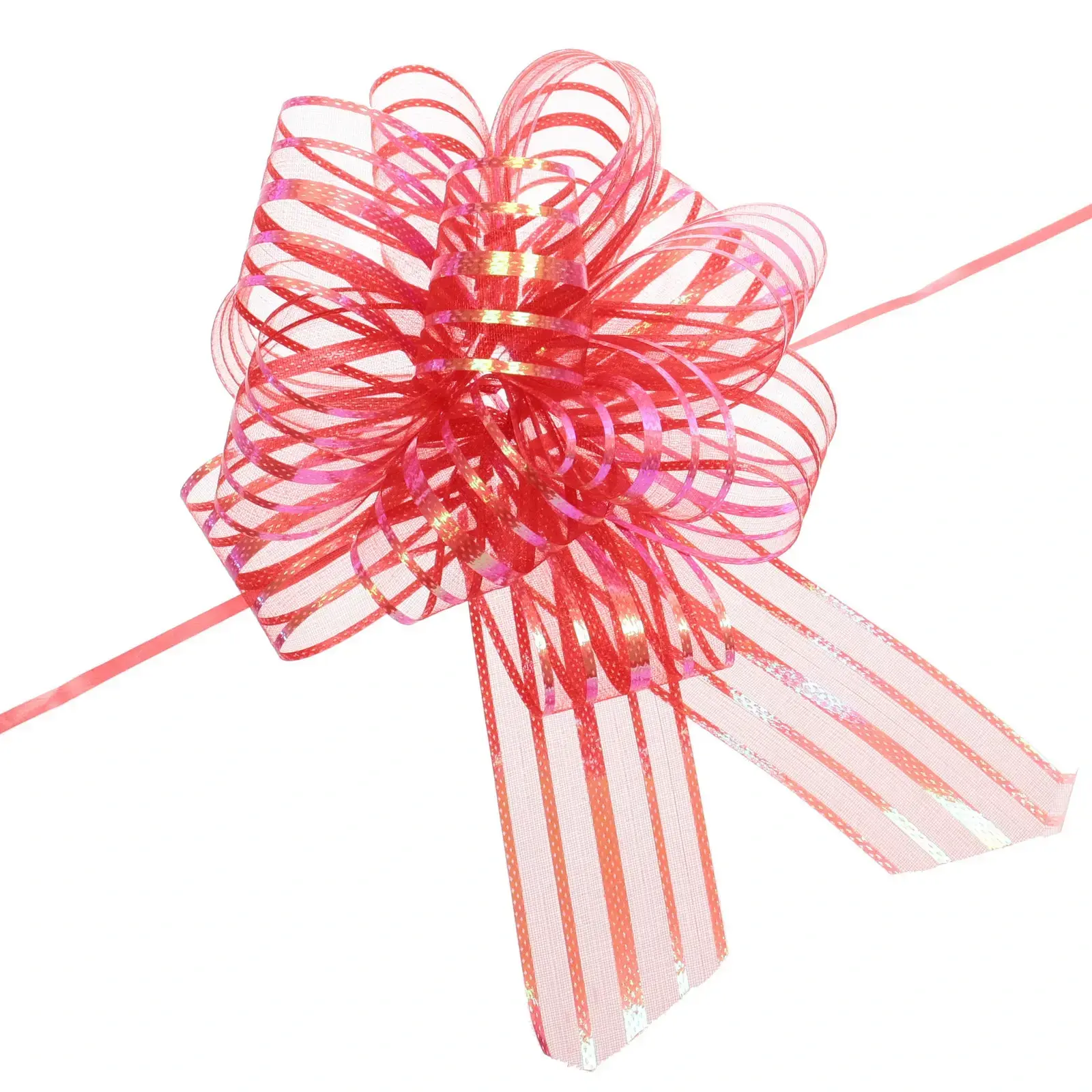 Бант выполнен из прочной полимерной ленты шириной 5 см и диаметром около 15 см. Основной цвет — красный с обильными блестящими вставками и золотистыми полосами. Волнистые, сверкающие хвостики банта обеспечивают эффектный внешний вид и легко дополняют любой стиль упаковки. Продукт поставляется в индивидуальной упаковке и сразу готов к применению.