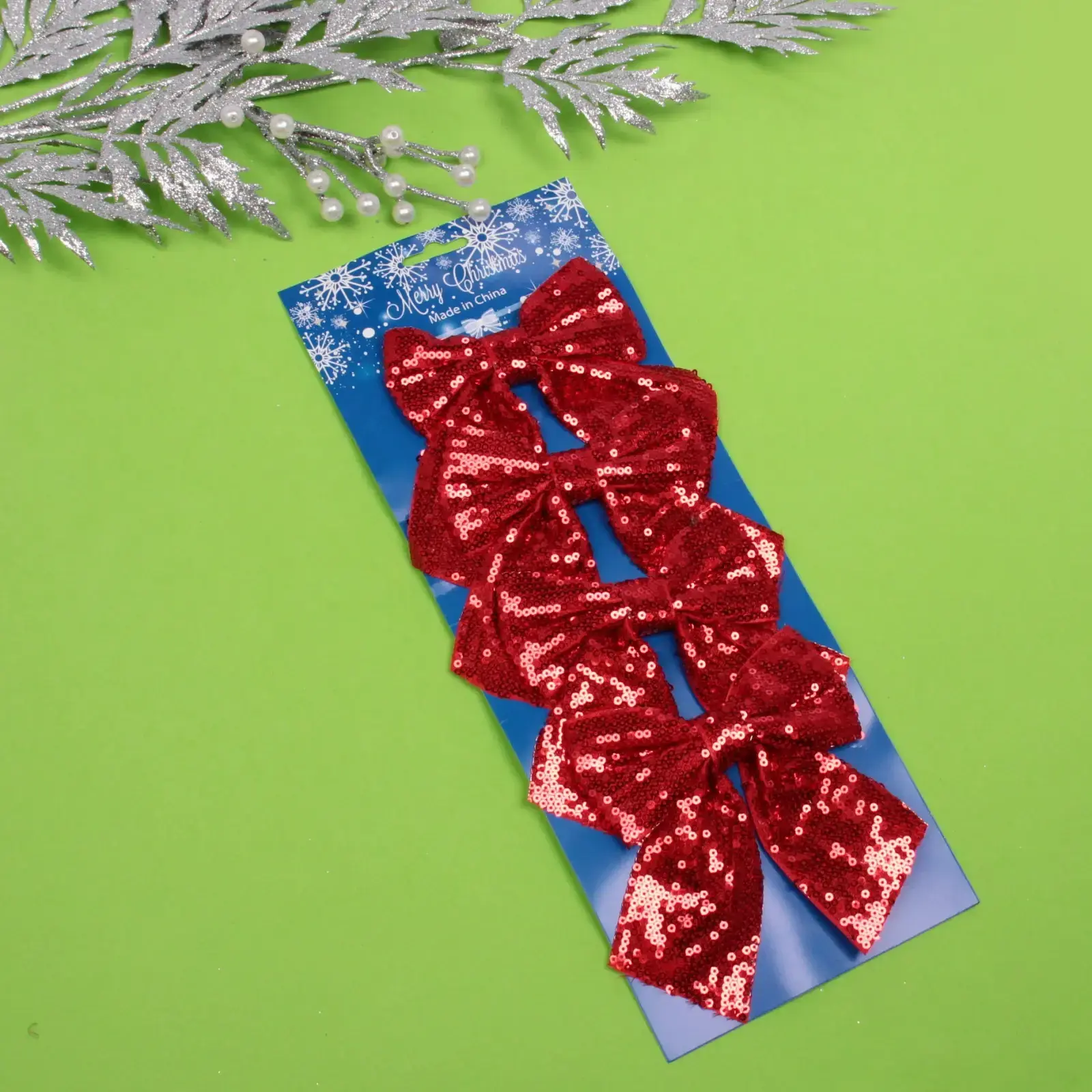 Размер каждого банта составляет 12х14 см, что делает их заметными, но не слишком громоздкими. Красный цвет с блестками добавляет яркости и радости в атмосферу праздника. Эти банты упакованы на картонной подложке с праздничным дизайном, что делает их отличным подарком для друзей и близких.