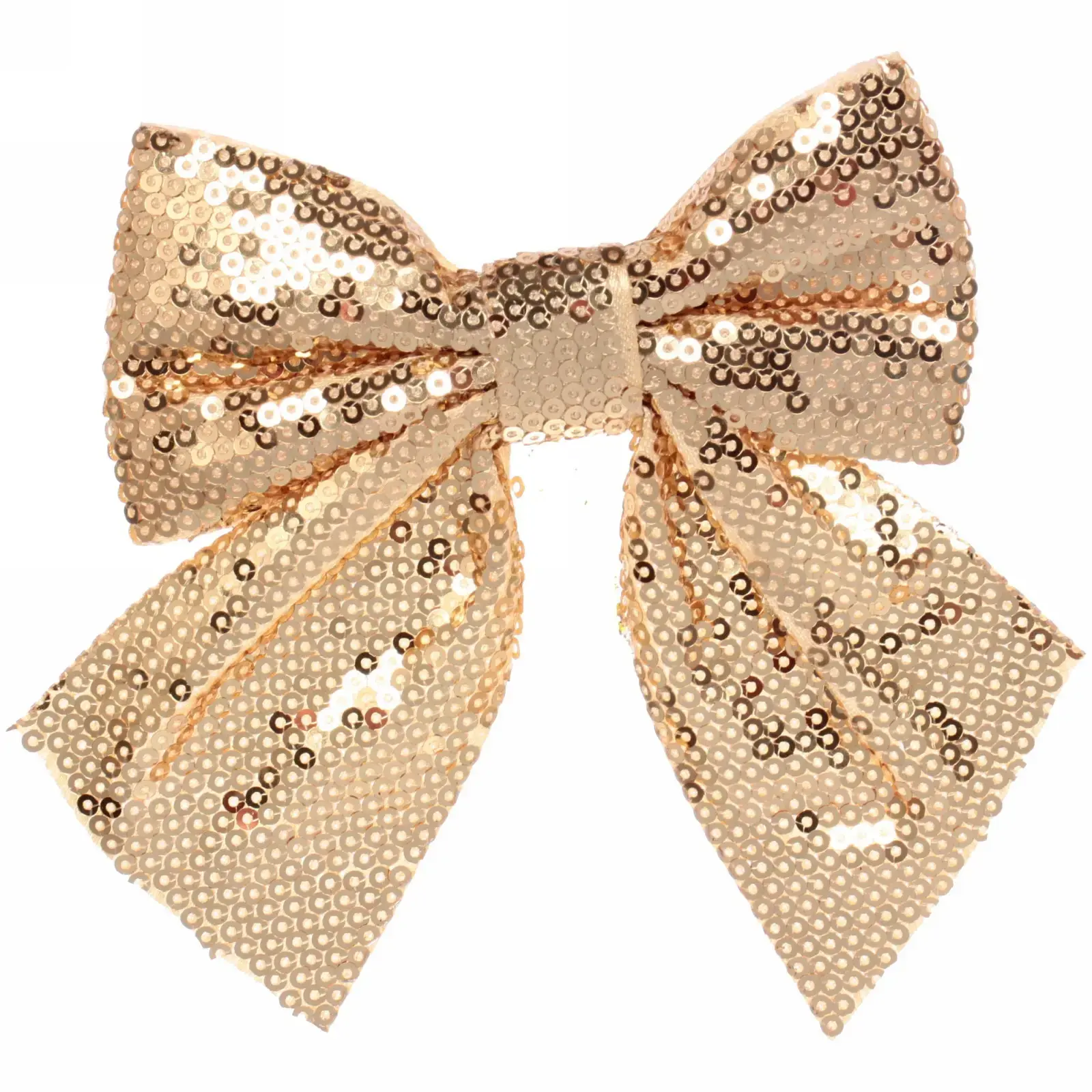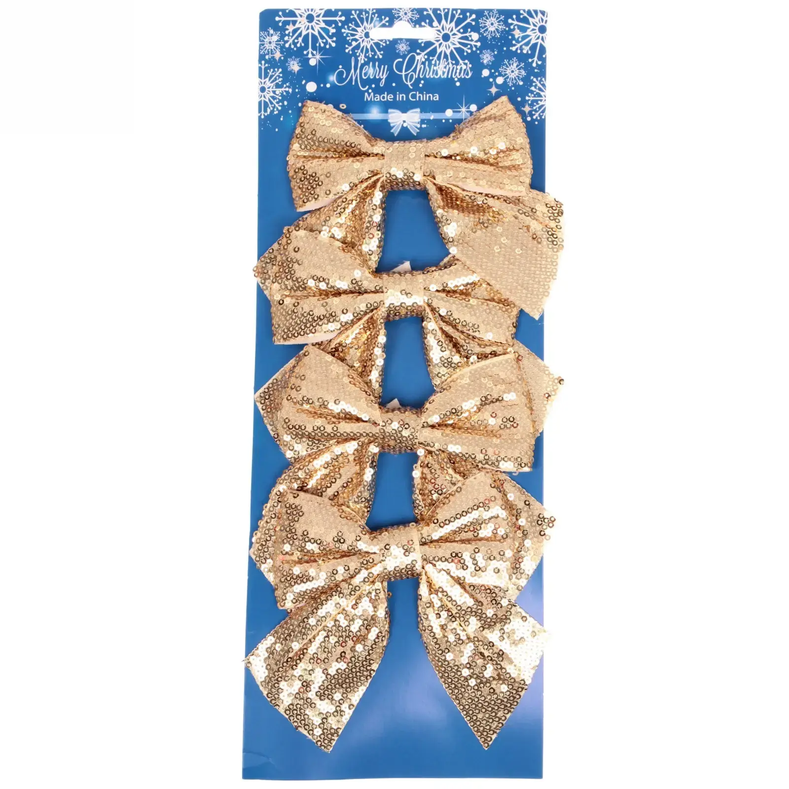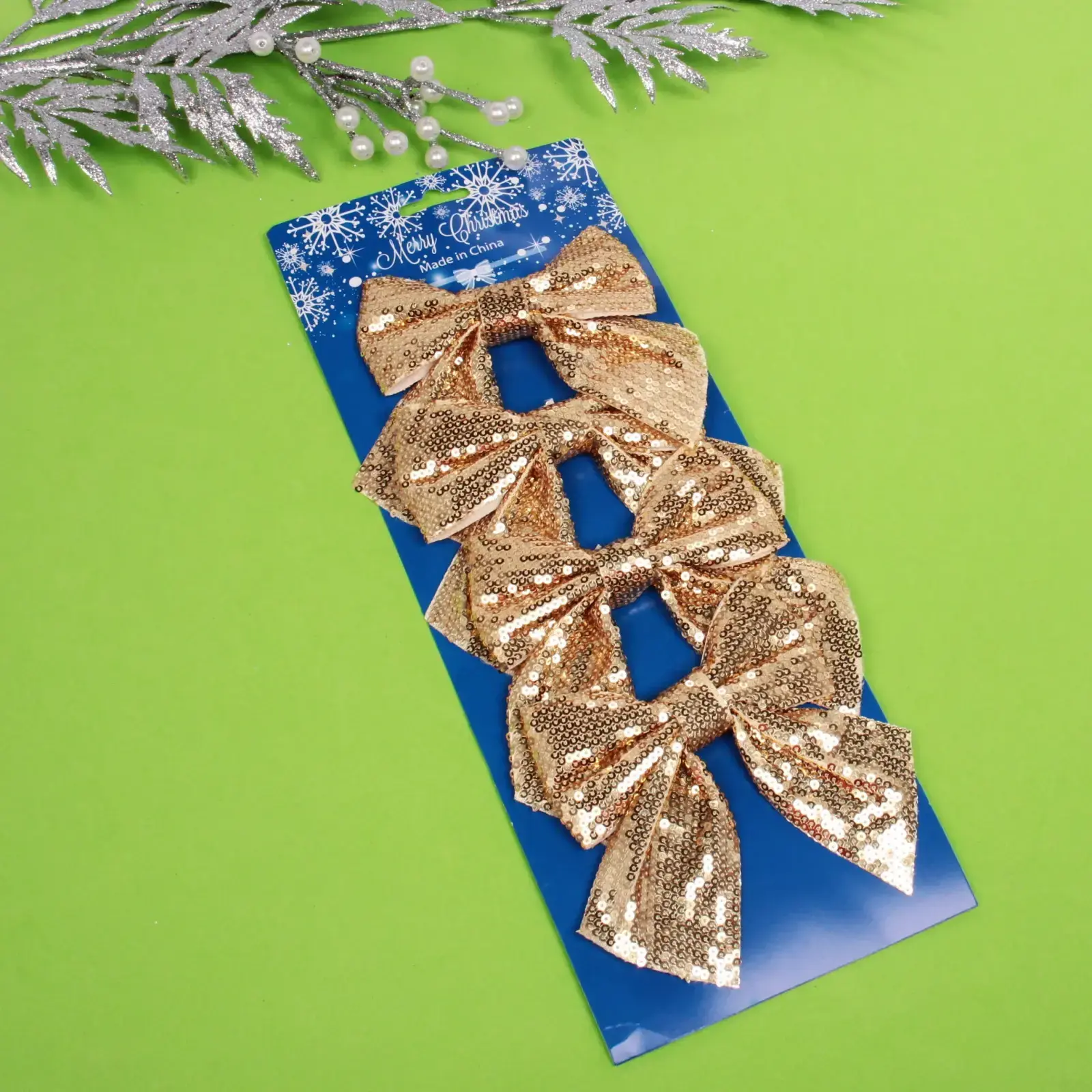 Каждый бант выполнен из качественного текстиля и украшен блестящими пайетками, что придаёт ему праздничный вид. Размеры банта составляют 12х14 см, что делает его достаточно крупным для заметного декора. Набор включает 4 банта, что позволяет вам использовать их в различных комбинациях. Праздничный дизайн с золотистыми оттенками и блестками идеально подходит для создания новогоднего настроения.