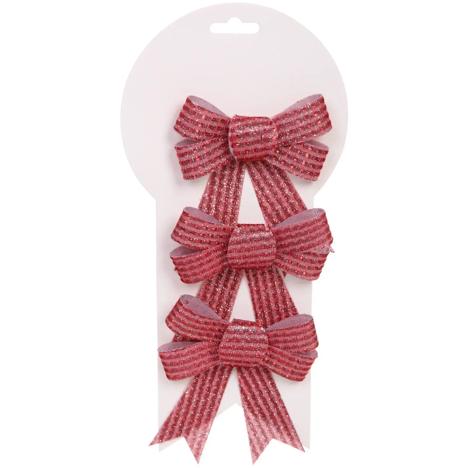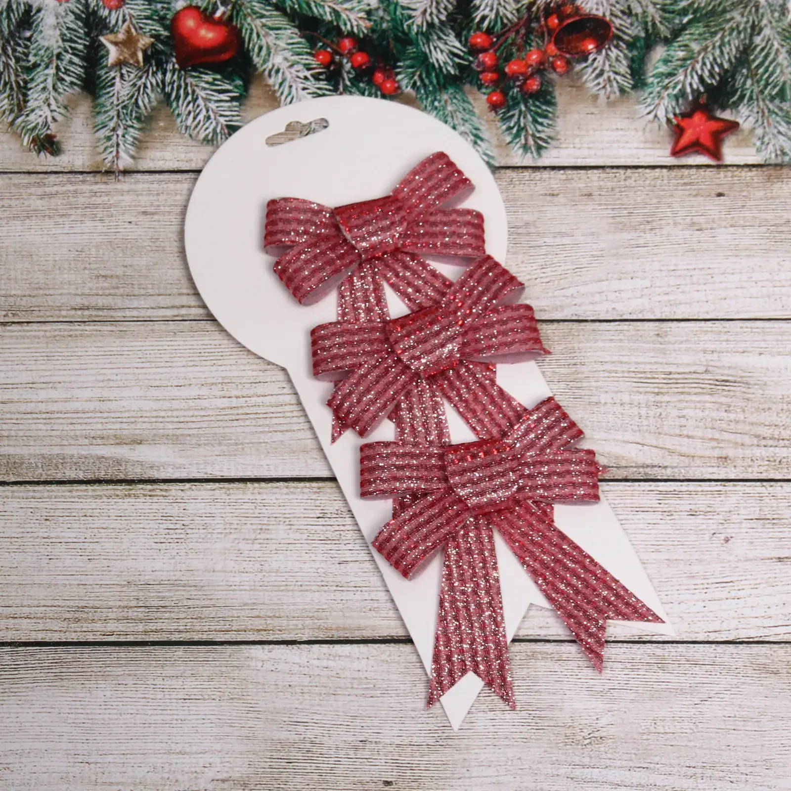 Бант легко крепится на ёлку благодаря специальному отверстию для подвешивания. Он подходит для украшения как домашних, так и офисных ёлок, а также может использоваться для декорирования подарков на праздники. Набор из трех бантов позволяет создать гармоничное оформление, сочетая их между собой или с другими элементами декора.