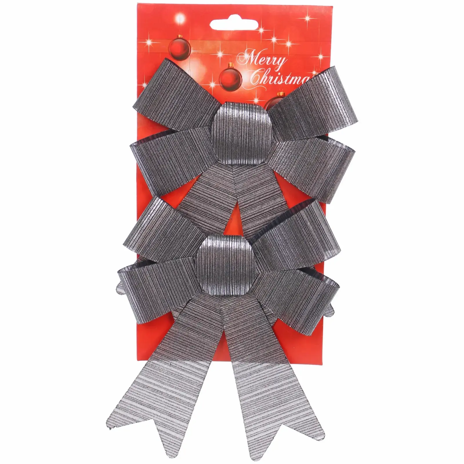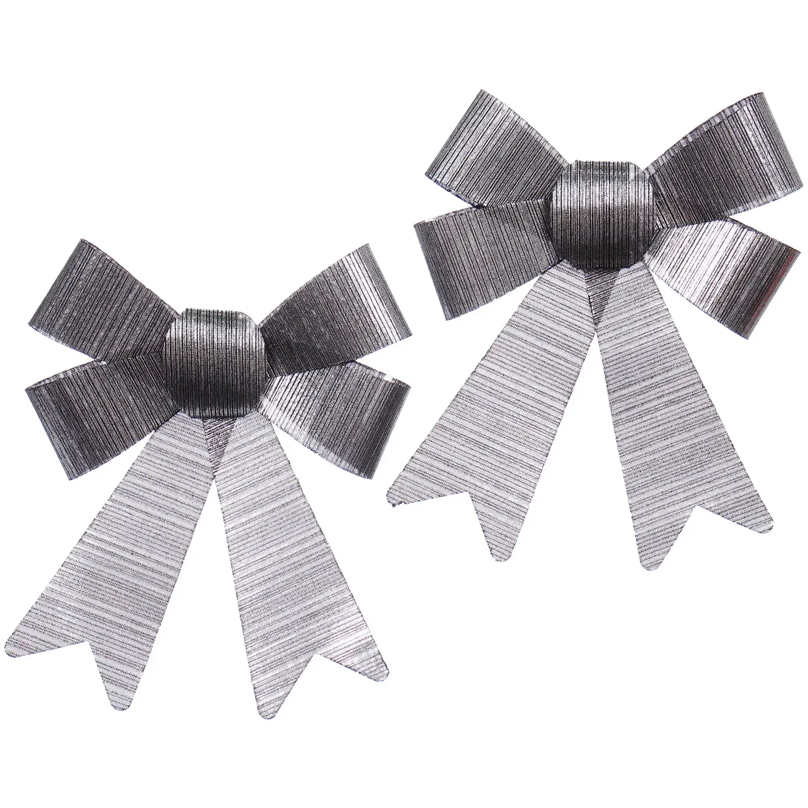 Размер одного банта — 13×18 см. Поверхность текстурирована полосками, что усиливает игру света. Цвет чёрный и темно-серый с блестящей отделкой. Изготовлен из ПВХ — прочного материала, устойчивого к деформации. В наборе одна единица.