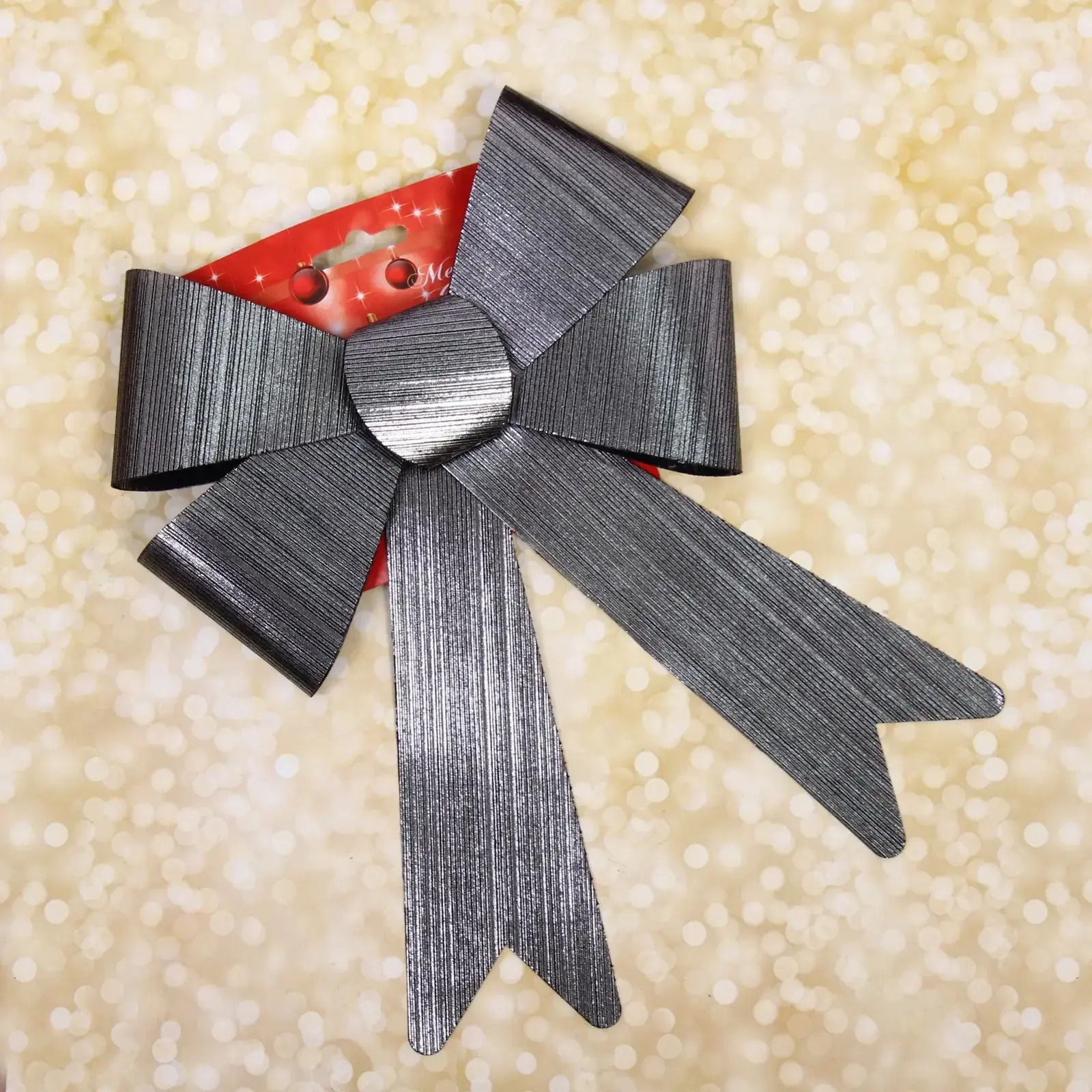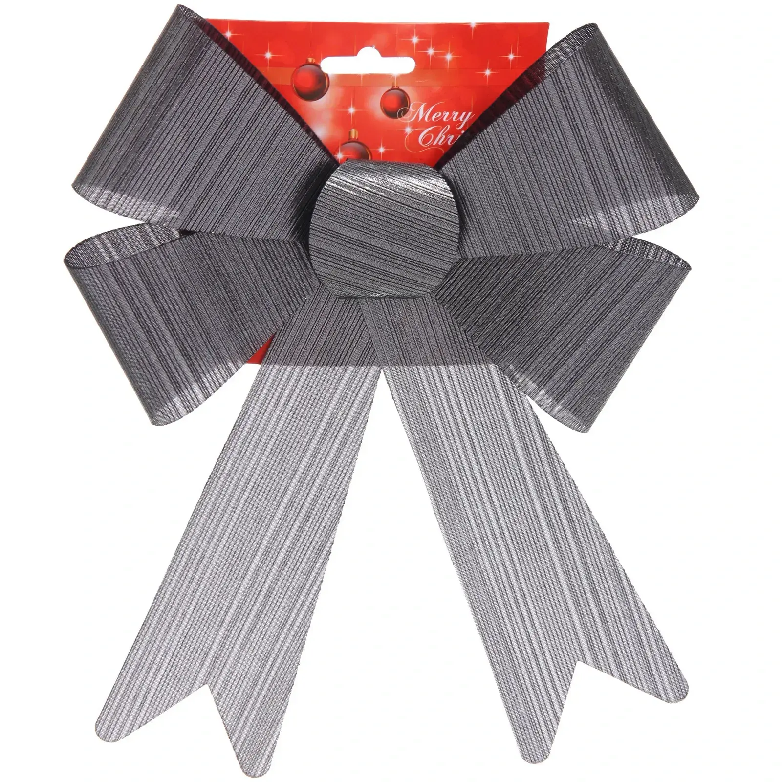 Бант имеет симметричную форму с широкими лентами, что делает его заметным и эффектным. Серебристый цвет с блеском прекрасно сочетается с другими новогодними украшениями, создавая гармоничный ансамбль. Упаковка с красным фоном и надписью «Merry Christmas» добавляет праздничного настроения и делает бант отличным подарком для близких.
