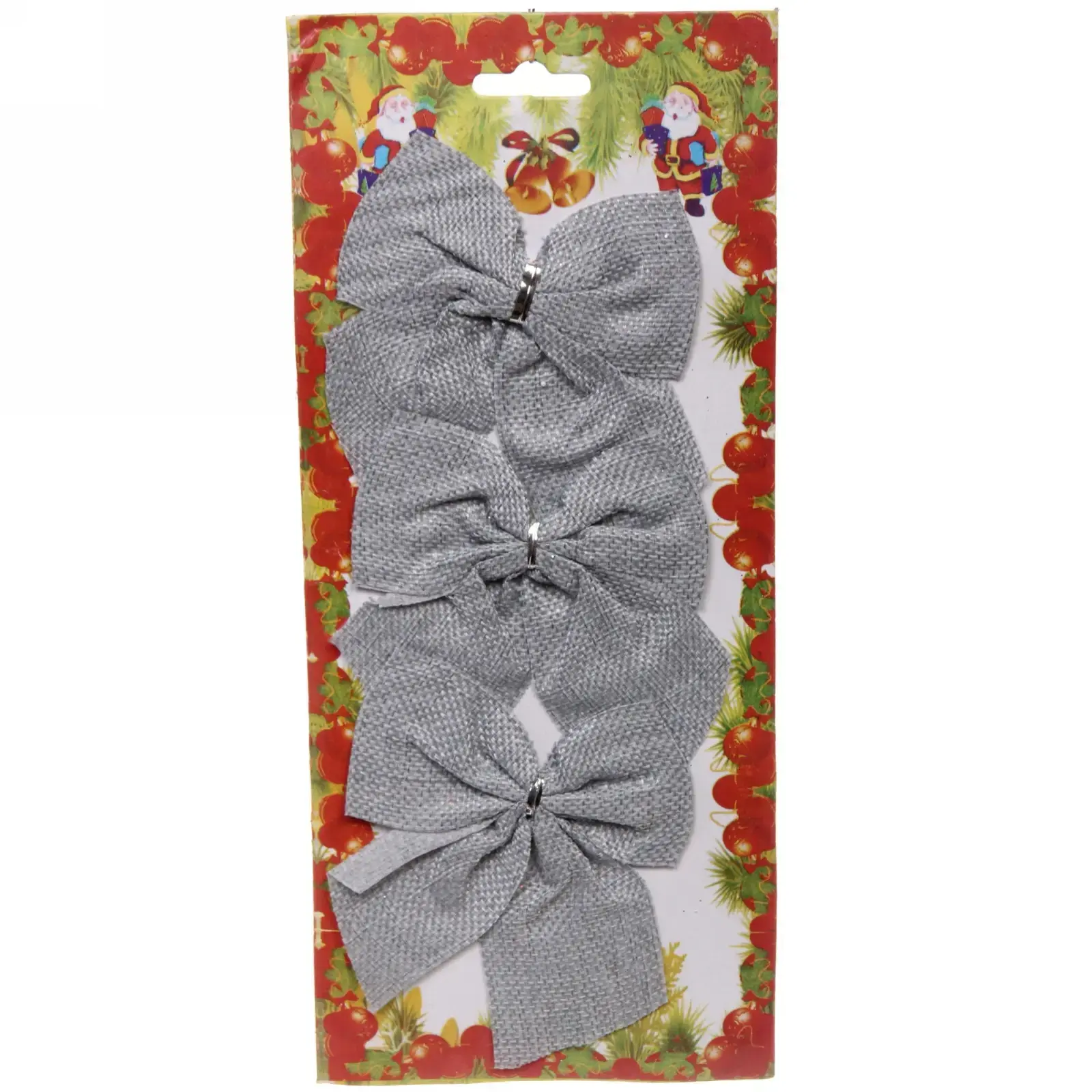 Каждый бант имеет размеры 9*10 см и выполнен из текстильного материала, что придаёт им мягкость и элегантность. Серебристый цвет с легким блеском добавляет праздничного настроения и делает их заметными на фоне зелёной ёлки. Упаковка оформлена в праздничном стиле, что делает этот набор отличным подарком для друзей и близких.