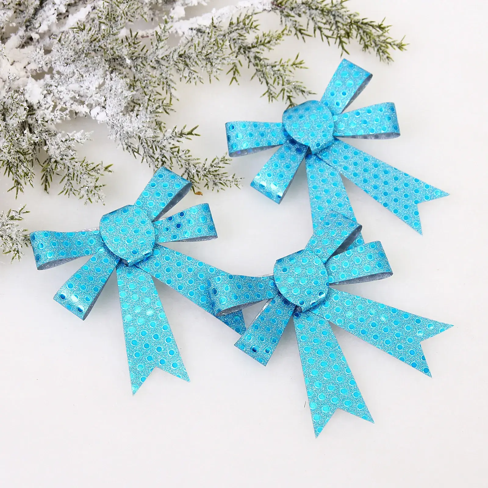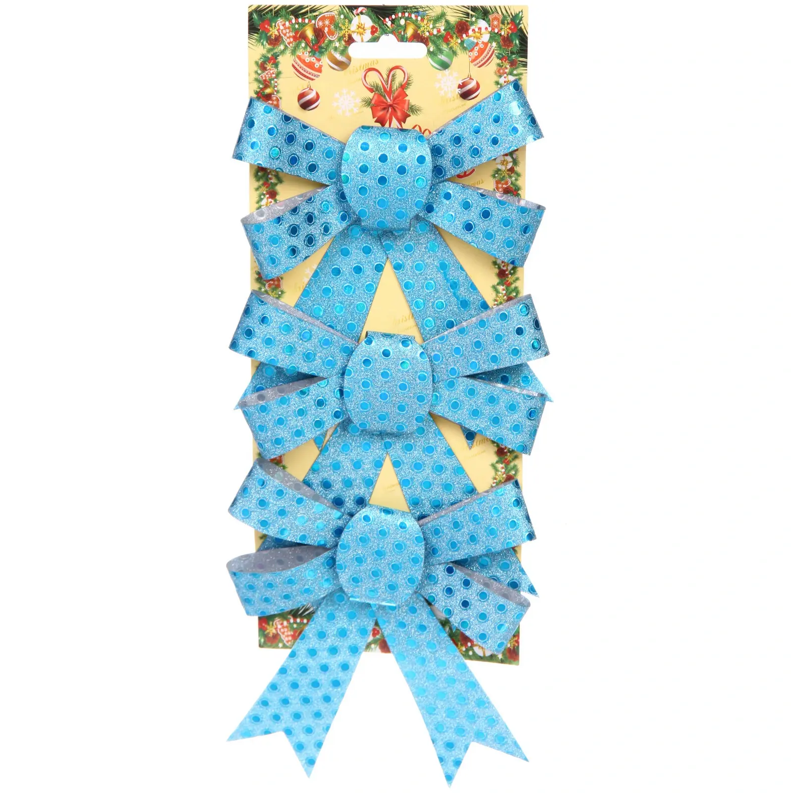 Размер каждого бант – 10х13 см, материал – текстиль с блестящим покрытием, цвет – голубой. Подойдет для украшения елки, упаковки подарков или создания праздничных композиций, делая ваш дом уютнее и ярче в новогодние праздники.