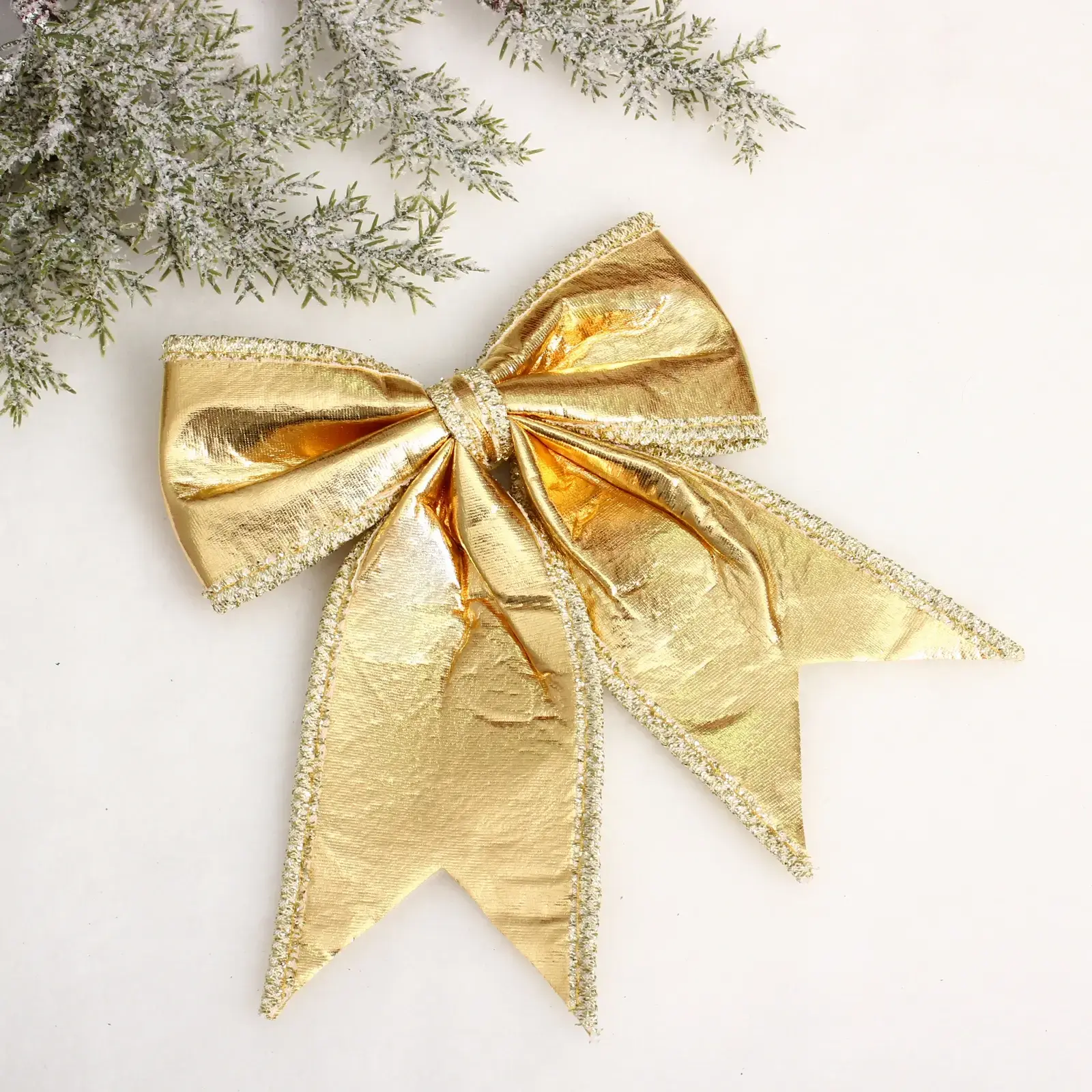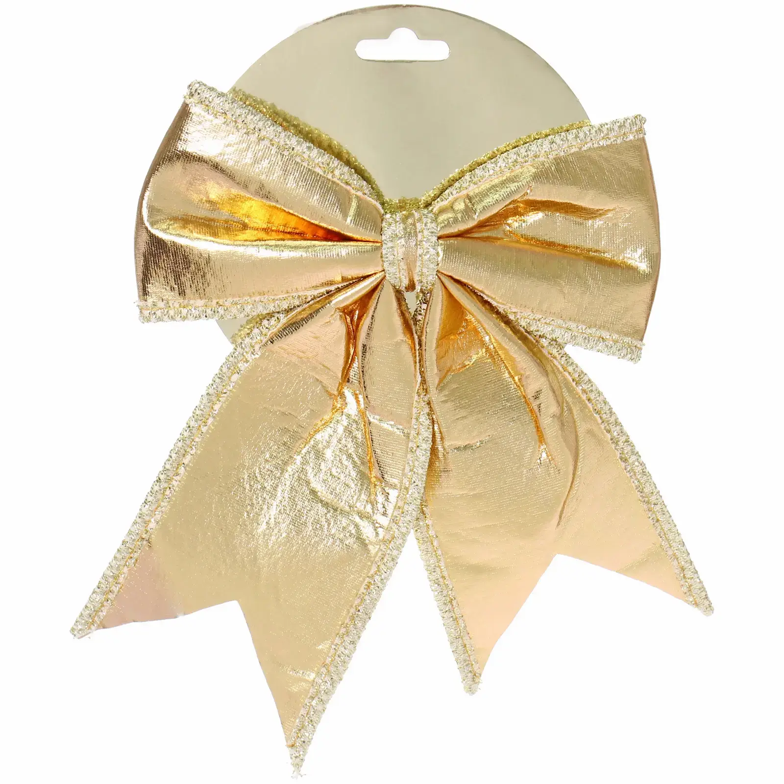 Бант изготовлен из качественного текстиля с золотистой окантовкой, что обеспечивает презентабельный внешний вид и долговечность. Размер 19х22 см отлично смотрится как самостоятельный элемент декора, так и в композиции с другими украшениями.