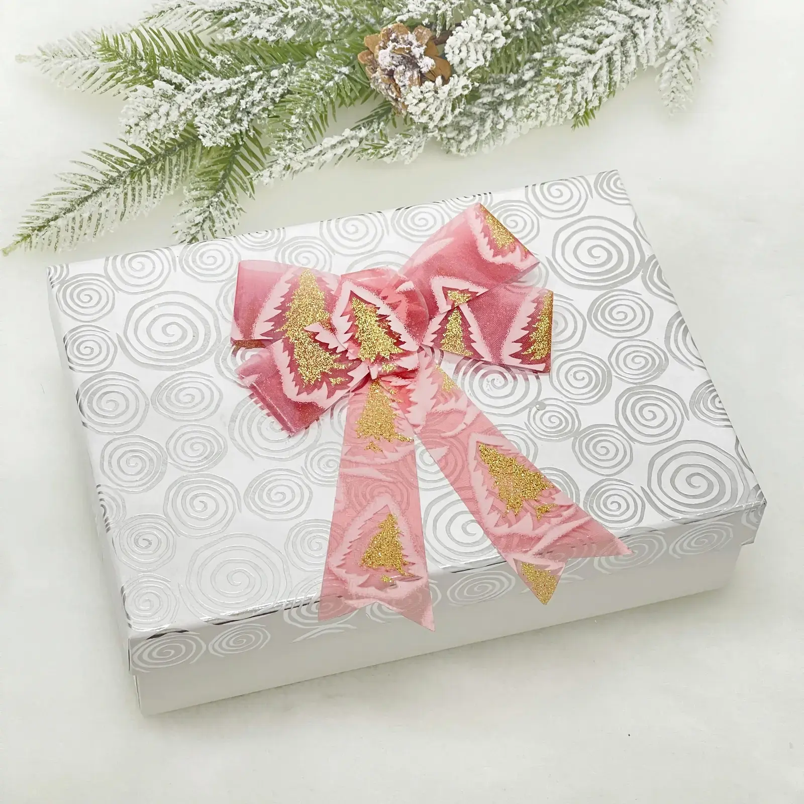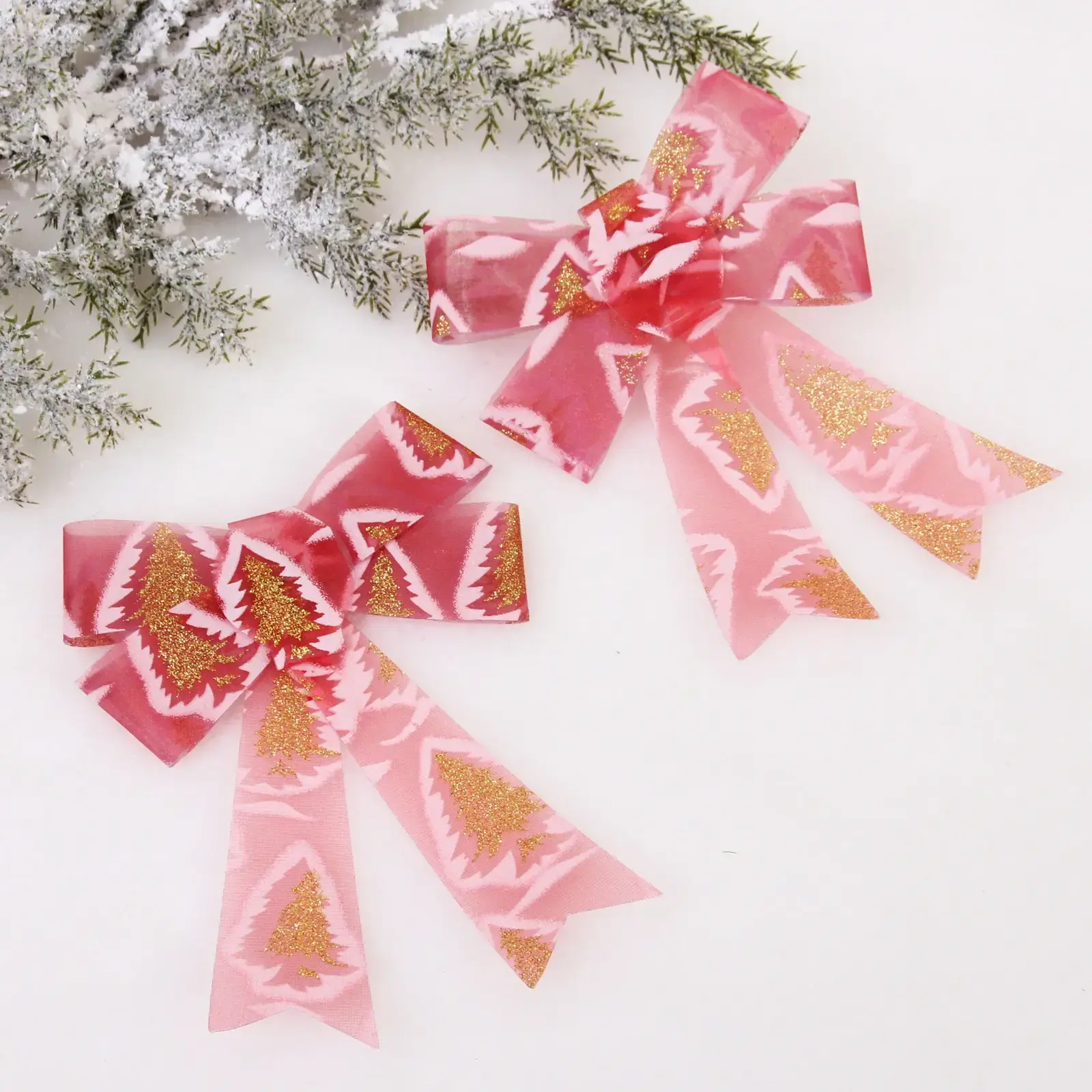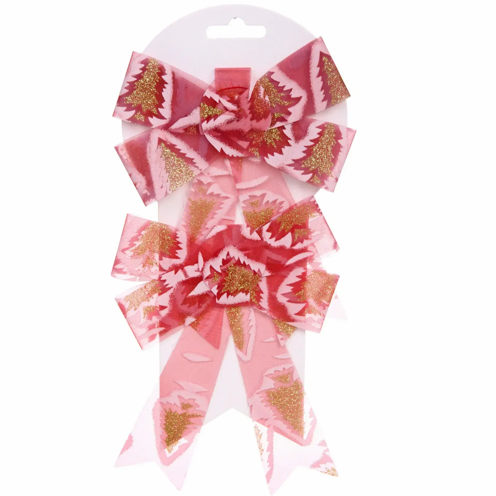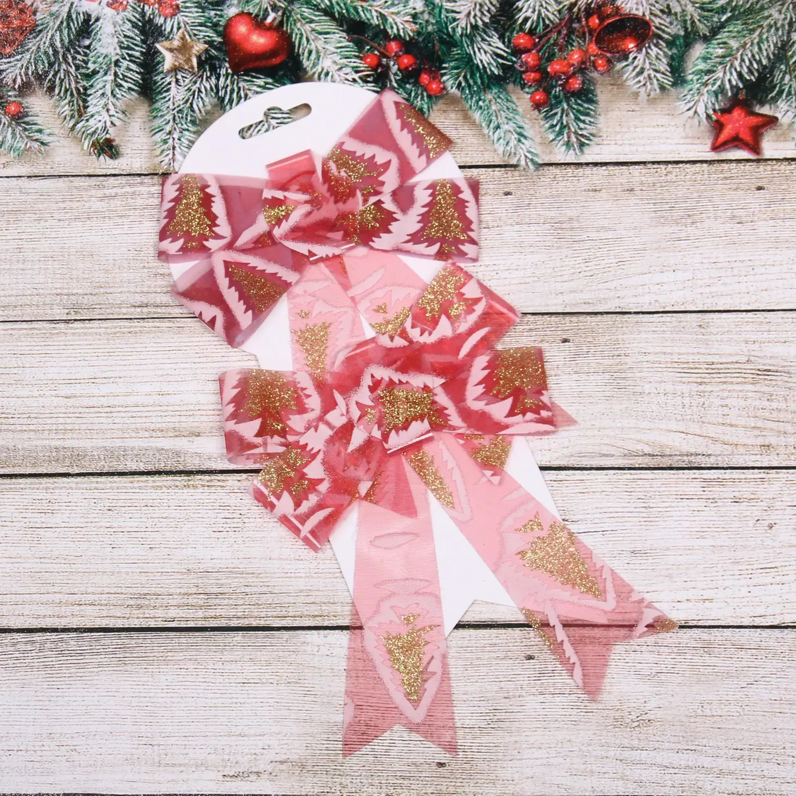 В наборе вы получите два банта, что позволяет использовать их в различных комбинациях. Каждый бант украшен рисунком в виде рождественских ёлок и золотистыми элементами, что делает их идеальными для создания новогоднего настроения. Не упустите возможность сделать ваш праздник незабываемым с бантом на ёлку «Очарование»!