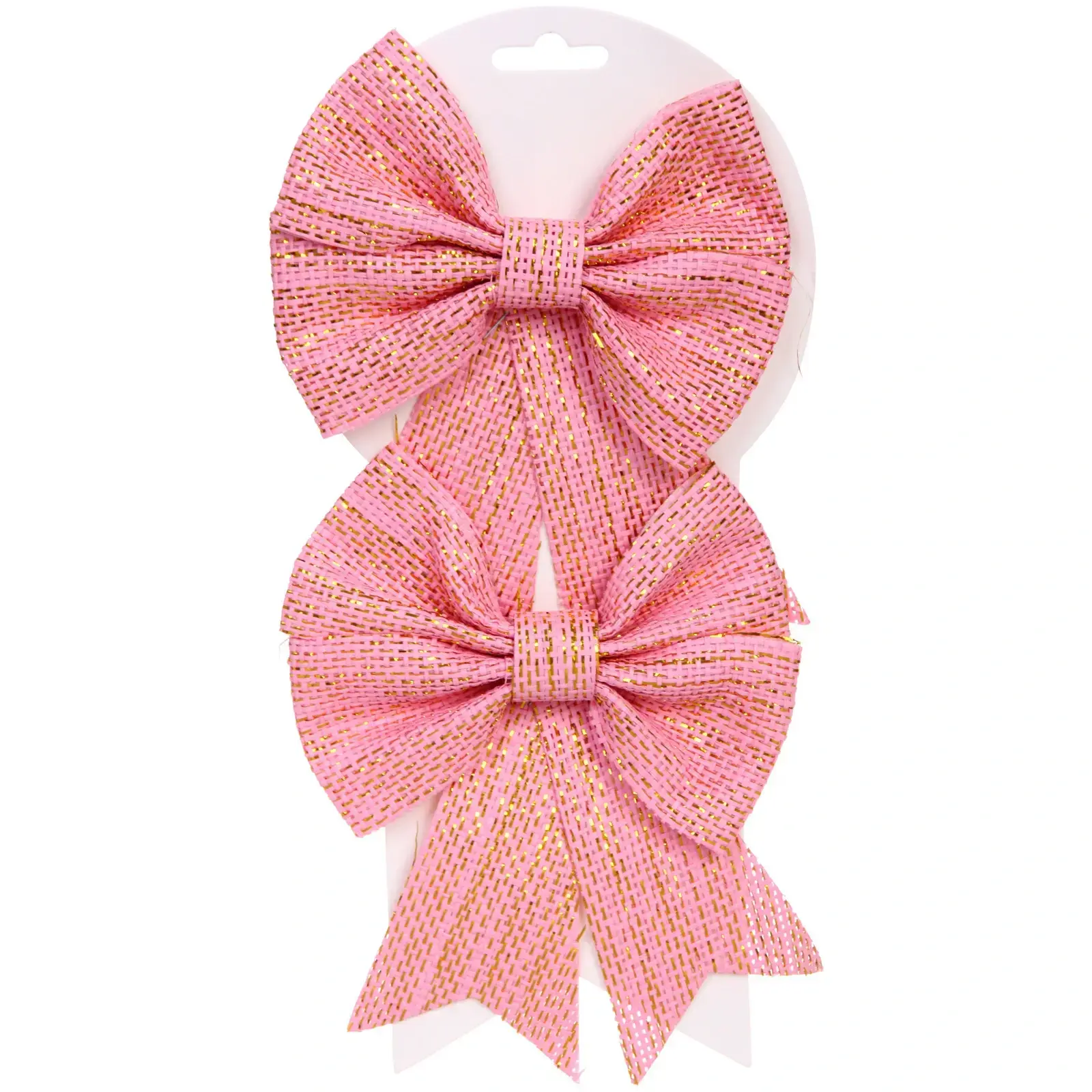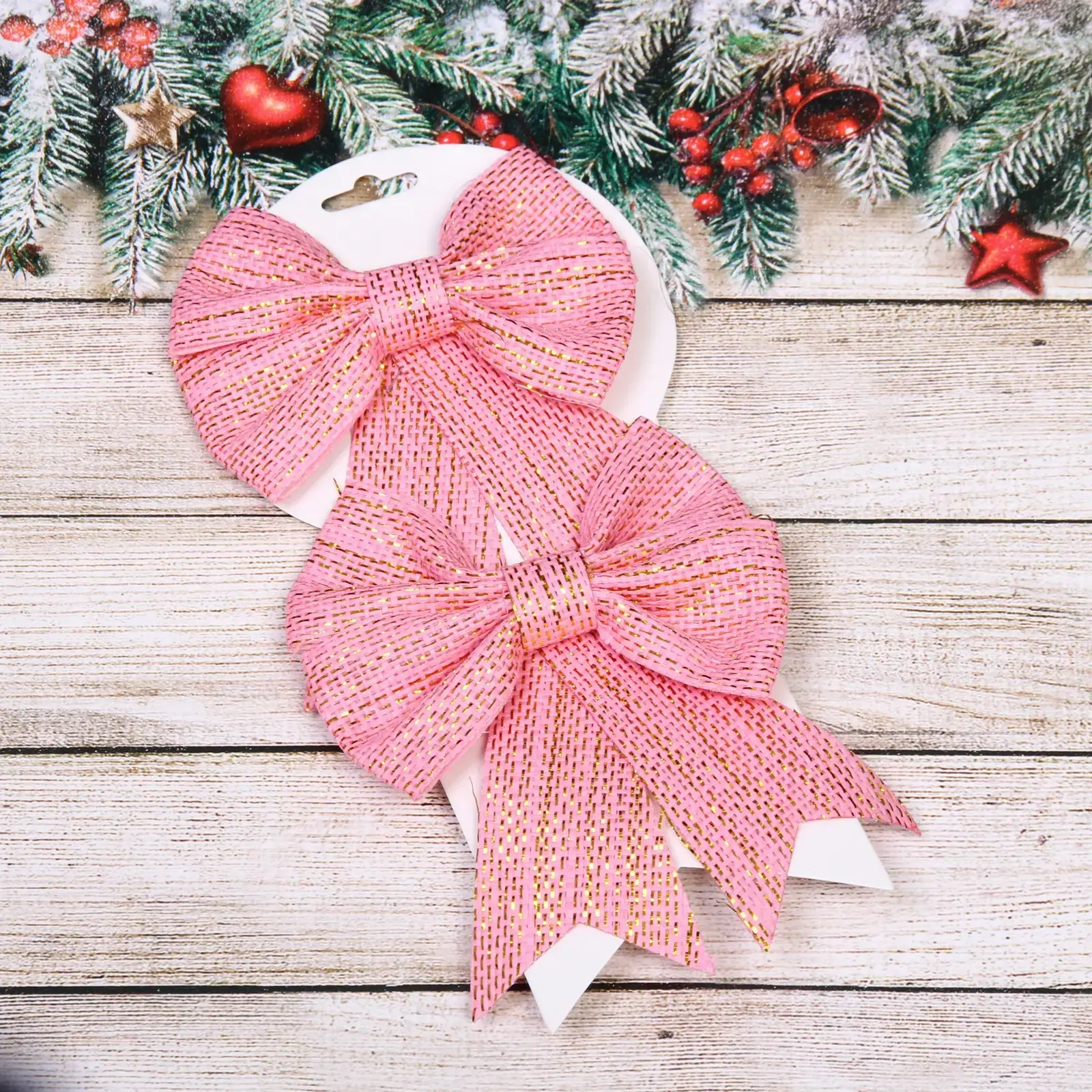 Бант выполнен из текстиля, приятного на ощупь и обладающего декоративным блеском за счёт добавления металлических нитей. Розовый цвет создаёт нежный, но запоминающийся акцент, а длина свисающих лент подчеркивает элегантность изделия. Простота крепления позволяет быстро оформить подарок или украсить интерьер, делая подготовку к праздникам особенно приятной и удобной.