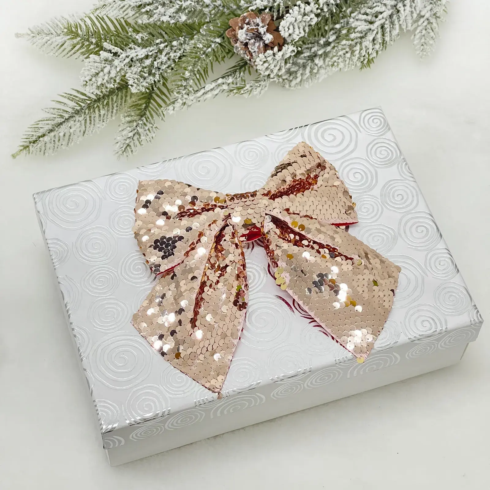 Размер банта составляет 16х17 см, что делает его заметным элементом декора. Он идеально подходит для украшения ёлки, а также может использоваться в качестве акцента в других праздничных оформлениях. Пайетки различного размера добавляют динамики и яркости, делая бантик настоящим украшением вашего праздника.