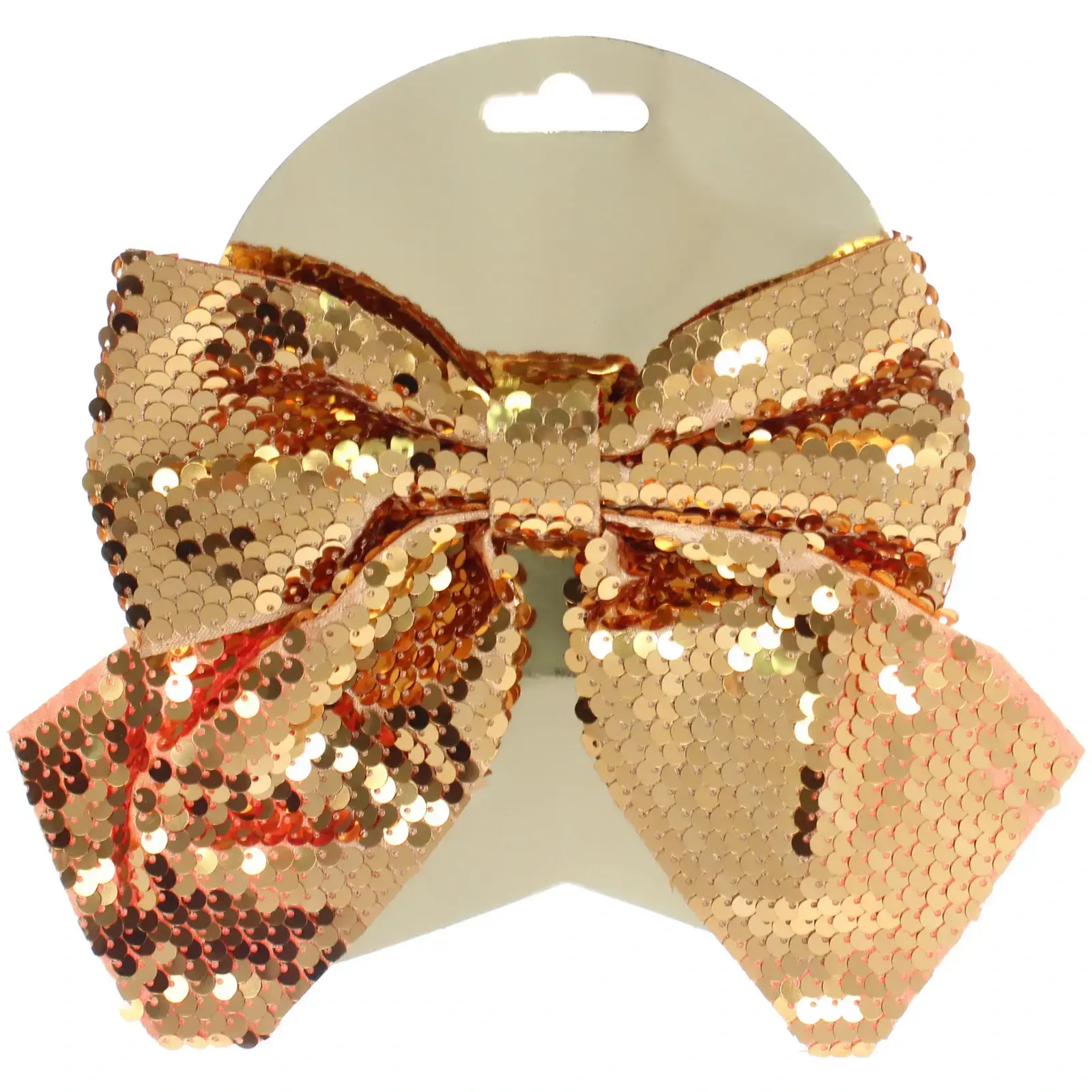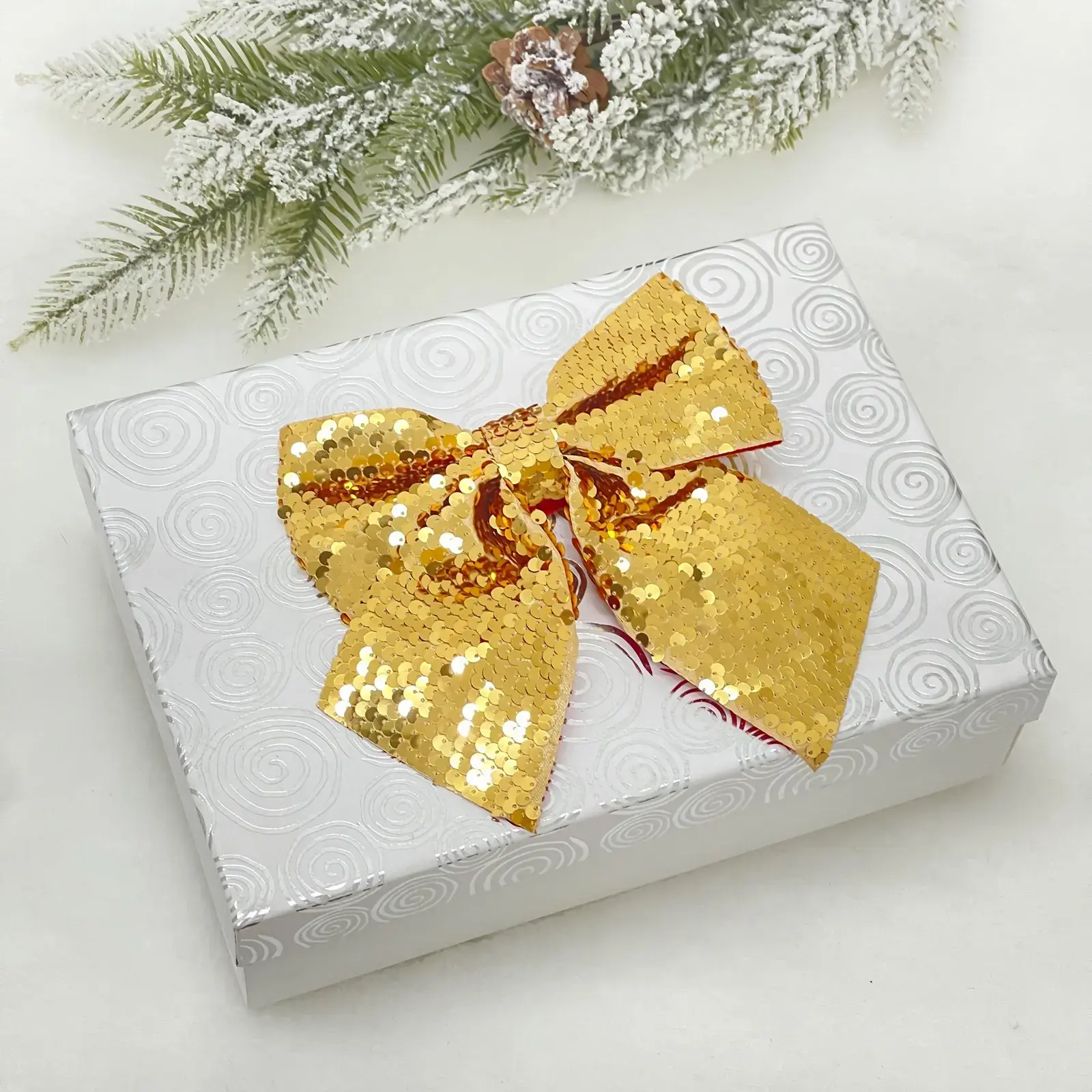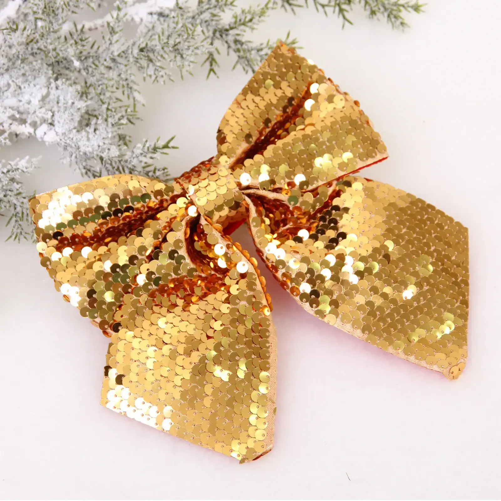 Этот роскошный бант станет идеальным украшением для новогодней ёлки или подарочной упаковки. Благодаря мерцающим пайеткам и насыщенному золотистому цвету, он привлекает взгляды и создает атмосферу праздника.