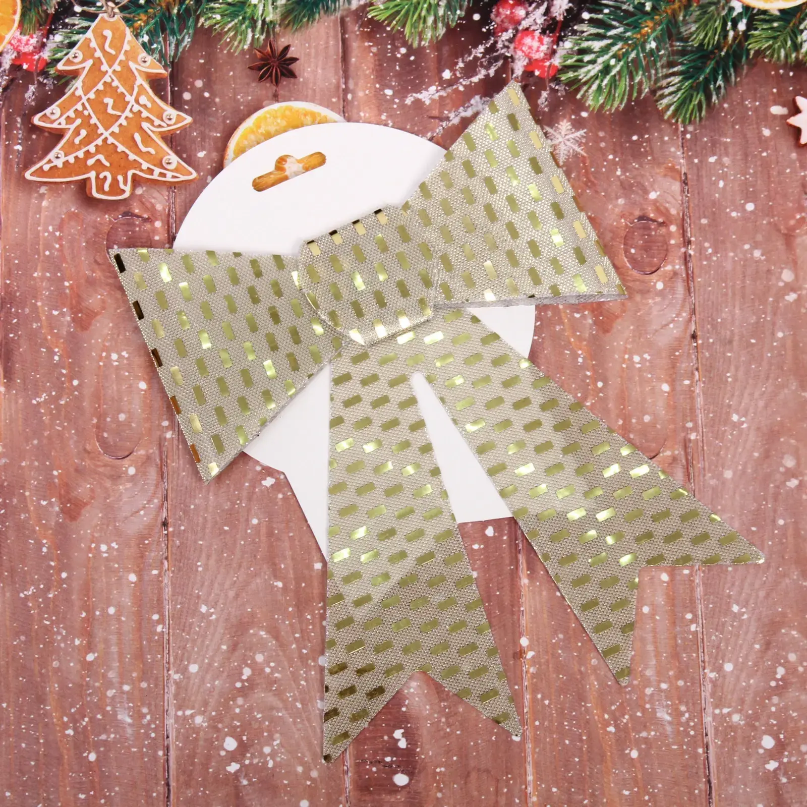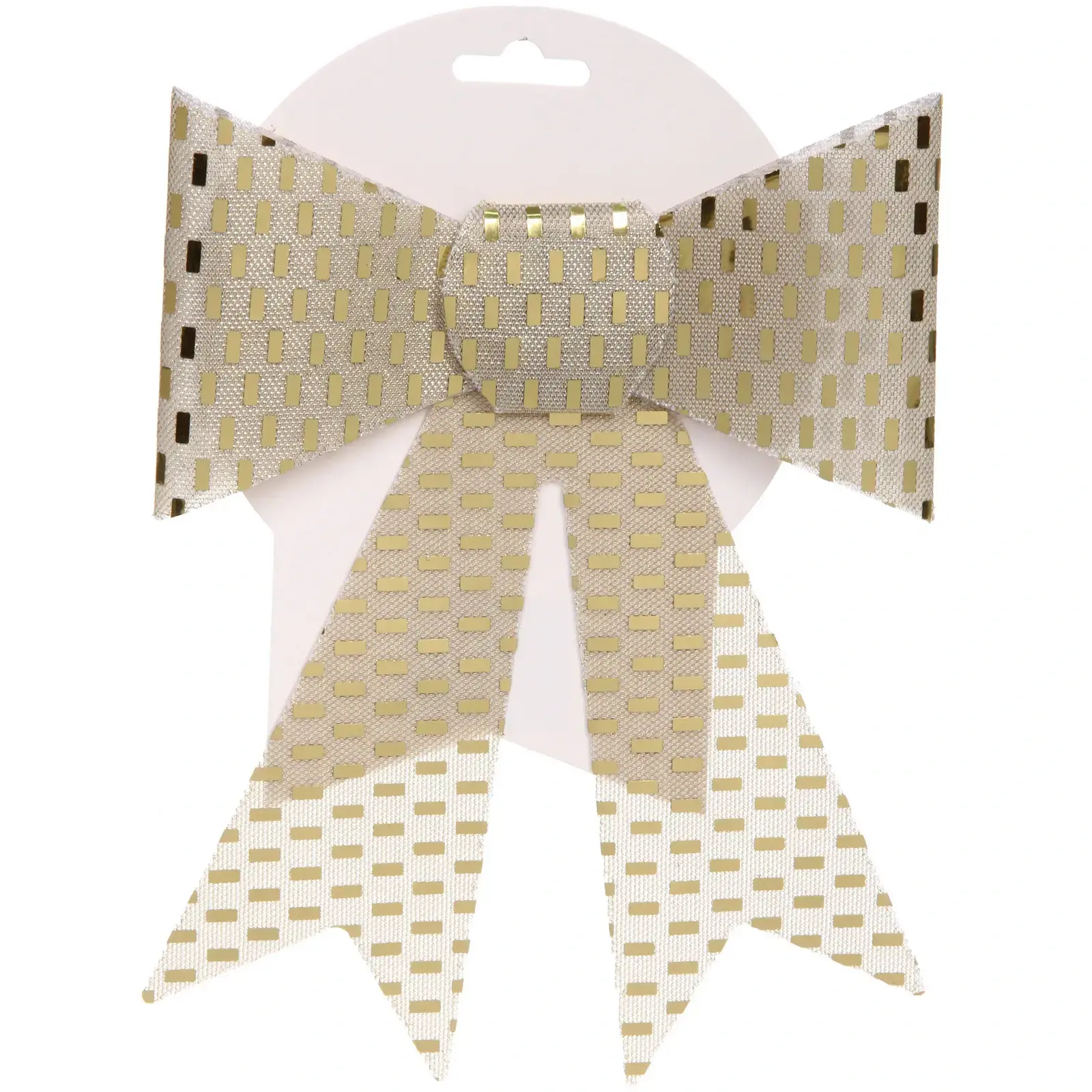 Почему стоит выбрать именно этот бантик? Во-первых, он выполнен из качественного ПВХ, что обеспечивает долговечность и устойчивость к повреждениям. Во-вторых, его размеры 16х21 см делают его заметным, но не слишком громоздким, что позволяет использовать его в различных вариантах декора. В-третьих, светло-шампань цвет с золотыми акцентами легко сочетается с другими цветами, что делает его универсальным элементом для любого праздника.