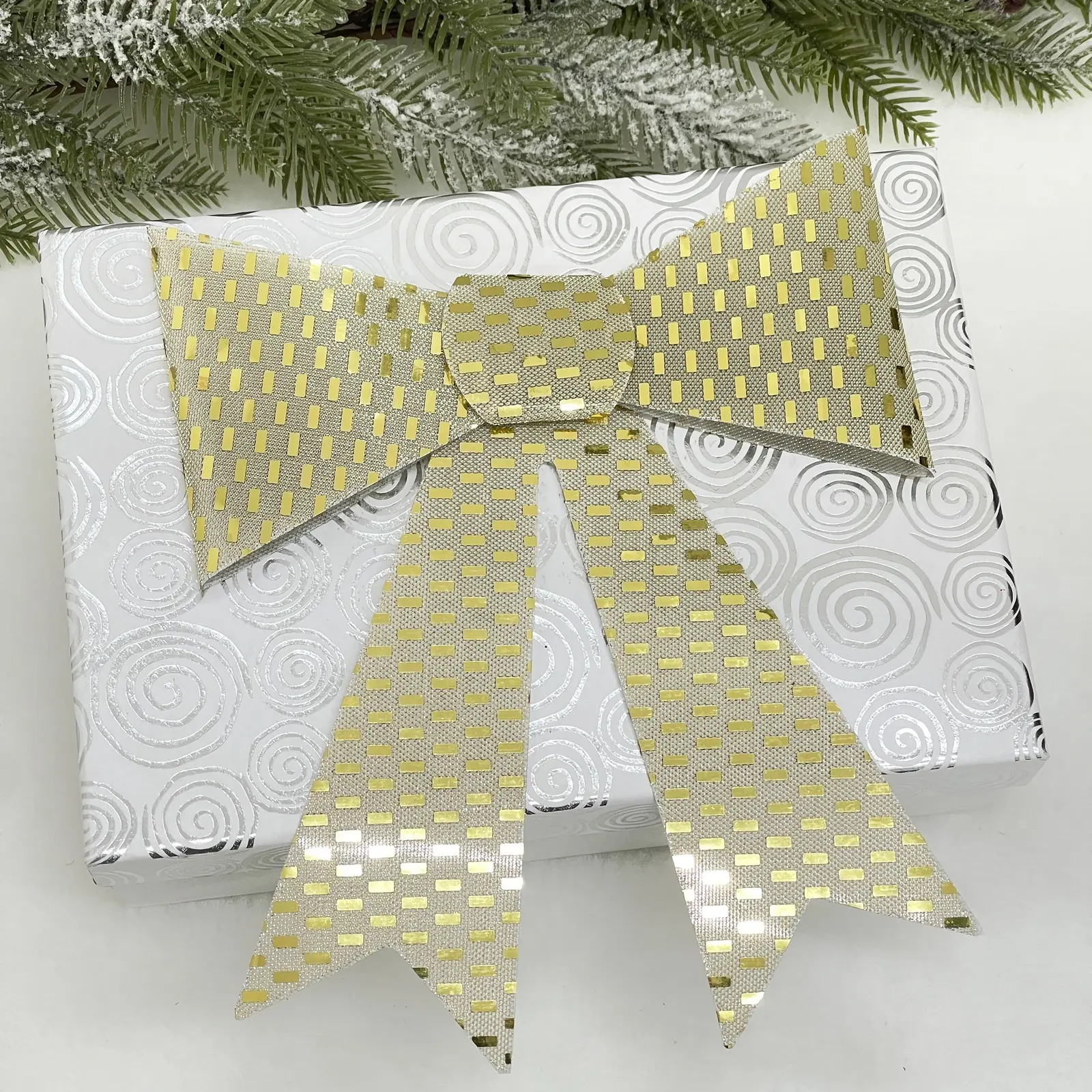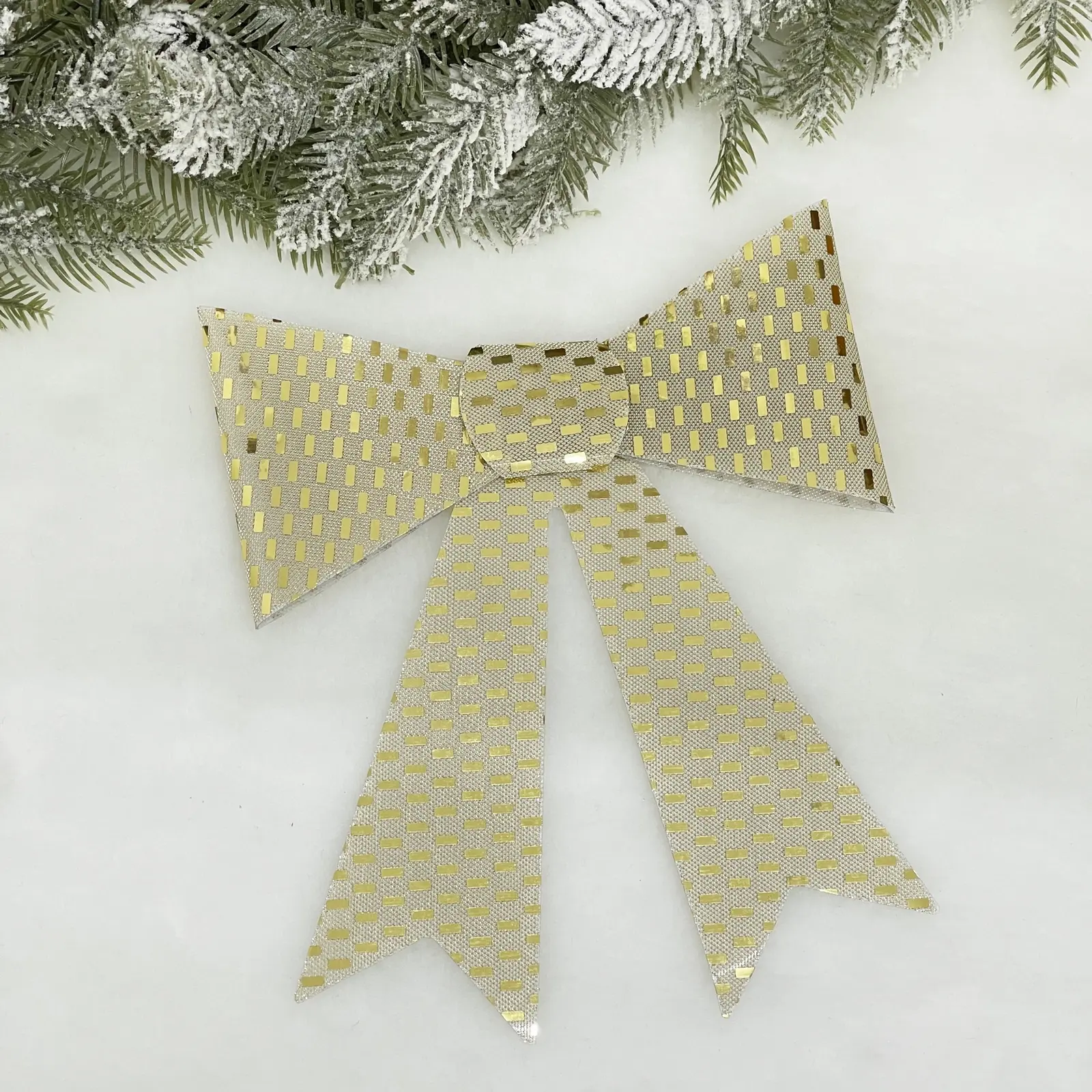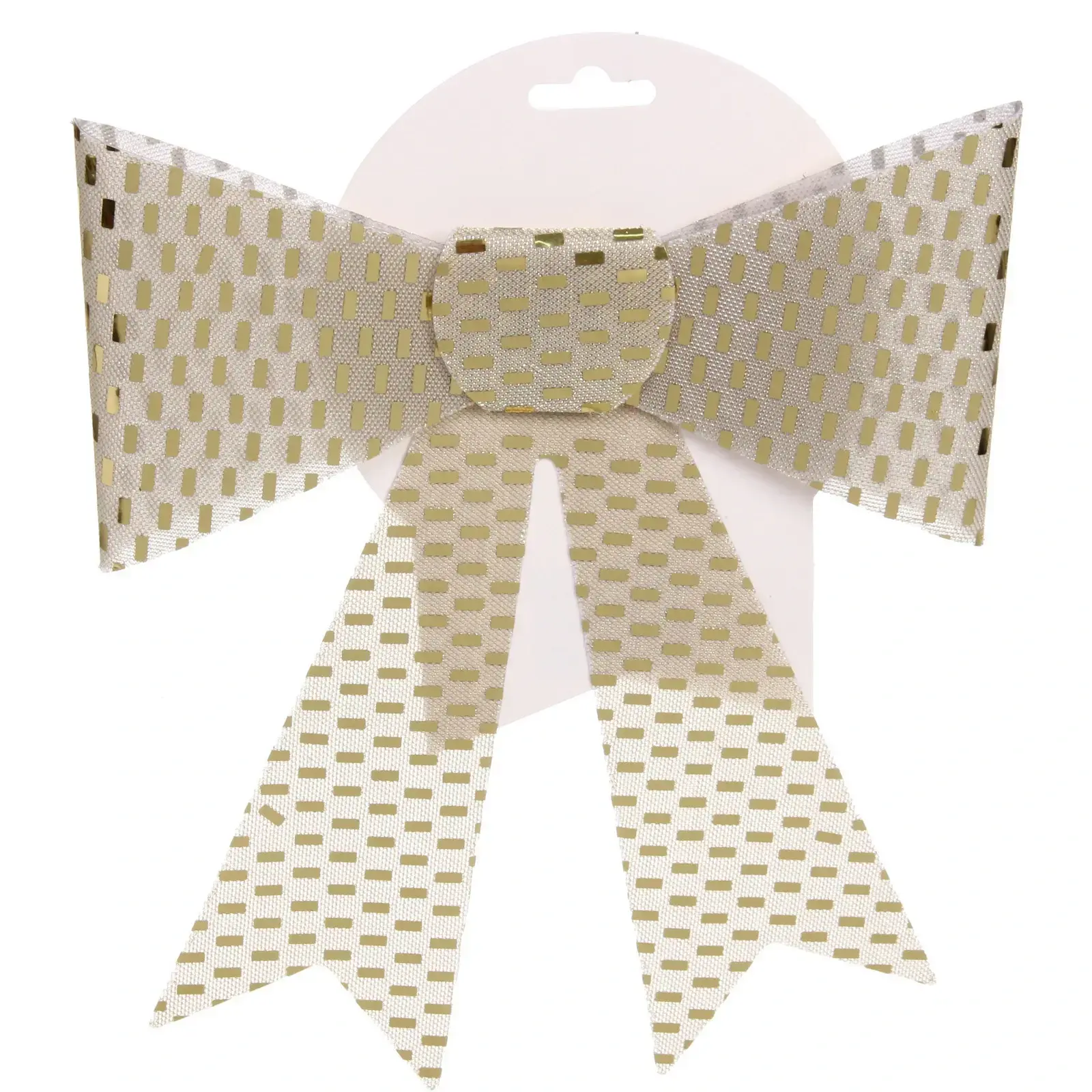 Бант изготовлен из ПВХ, что делает его легким и удобным в использовании. Он легко крепится на ёлку или подарки благодаря специальной картонной подложке с вырезом для подвешивания. Размеры банта составляют 20 см в ширину и 26 см в высоту, что делает его универсальным для различных стилей оформления.