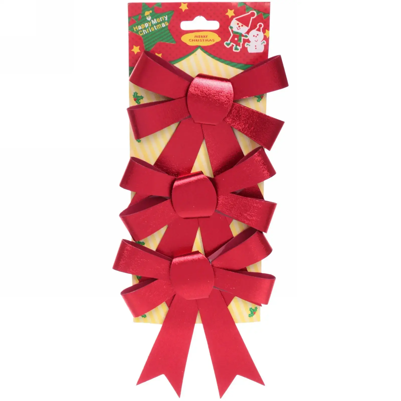 В наборе вы получите три банта, каждый из которых выполнен в ярко-красном цвете. Размеры бантов не указаны, но они имеют средние размеры, что делает их универсальными для различных применений. Упаковка оформлена в праздничном стиле, что делает её отличным вариантом для подарка.
