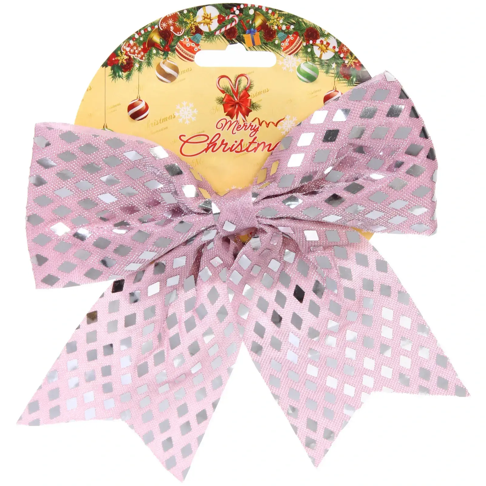 Бант изготовлен из синтетической ткани, что обеспечивает его долговечность и устойчивость к повреждениям. Он крепится к картонной подложке с праздничным дизайном, на которой изображены гирлянды и шарики, а также надпись «Merry Christmas», что подчеркивает его новогоднюю тематику. Этот бантик станет отличным выбором для тех, кто хочет сделать свои подарки по-настоящему особенными.