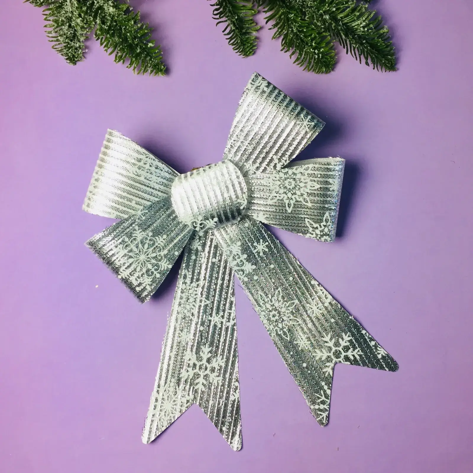 Выбирая бант «Снежинка», вы получаете не только красивое украшение, но и практичное решение для создания праздничного настроения. Его серебристый цвет и рифлёная текстура делают его универсальным элементом декора, который легко сочетать с другими украшениями. Бант также украшен белыми снежинками, что добавляет ему оригинальности и делает его ещё более привлекательным.