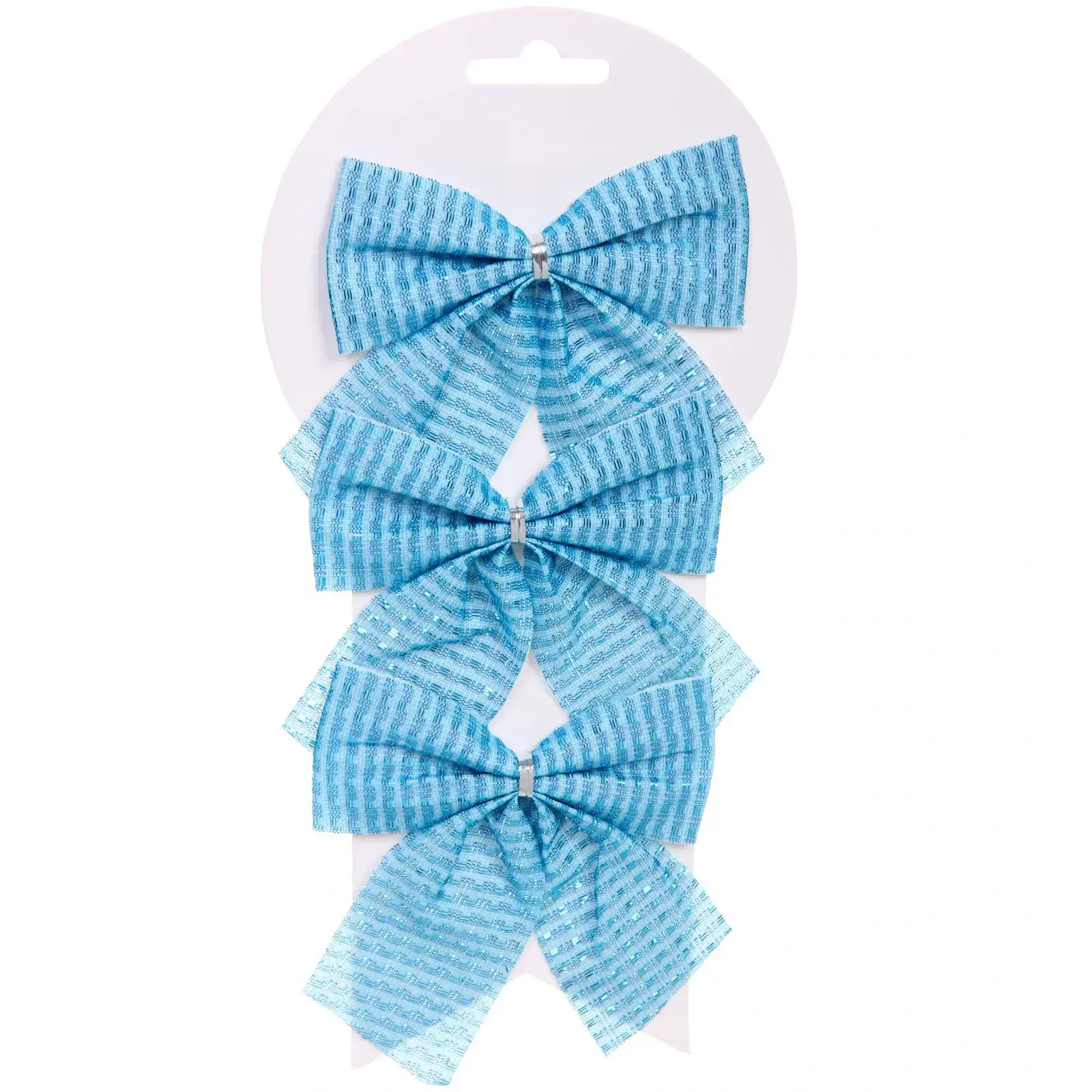Бант на ёлку «Волшебство» — это идеальное украшение для создания праздничной атмосферы. Его светло-голубой цвет и блестящие полоски добавят яркости и стиля вашему новогоднему декору. Каждый бант имеет размер 11*12 см и выполнен из качественного текстиля, что гарантирует долговечность и привлекательный внешний вид.