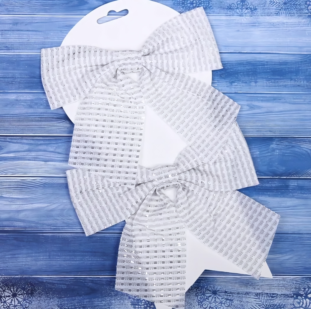 Материал — качественный текстиль, приятный на ощупь и стойкий к деформации. Каждый бант имеет аккуратные свисающие концы и крепление, позволяющее быстро закрепить украшение без дополнительных инструментов.