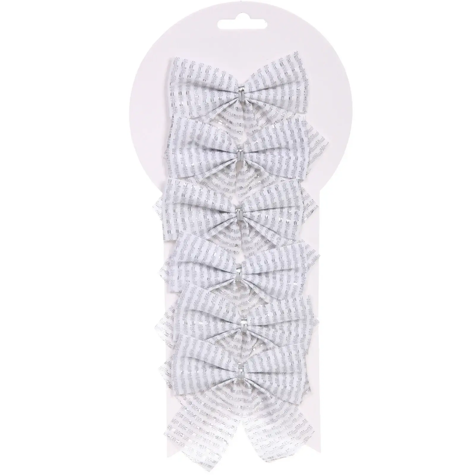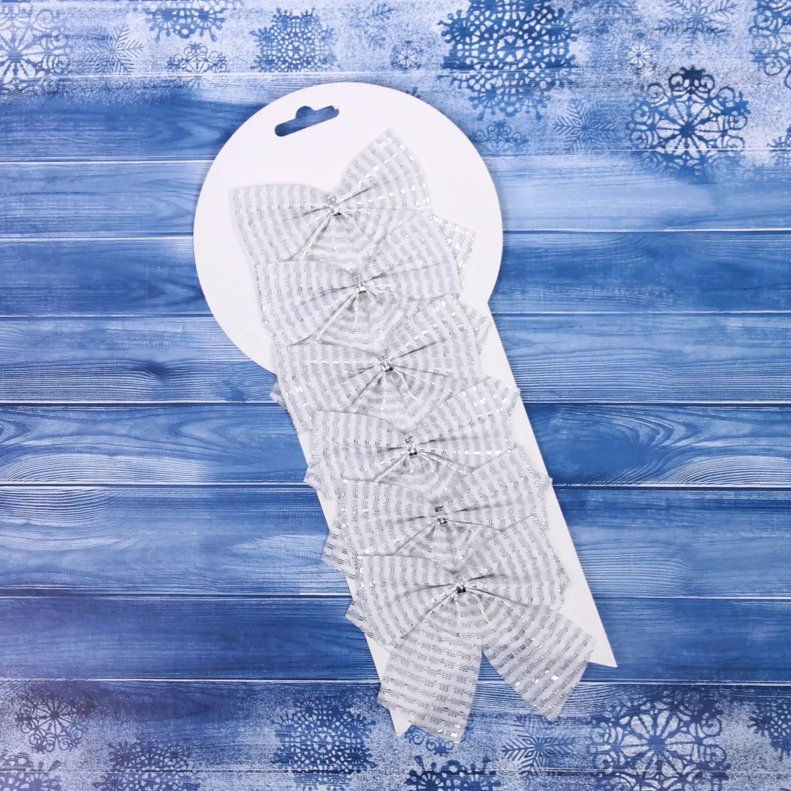 Размер каждого бантика составляет 8,5*9 см, что делает их достаточно заметными и эффектными. Серебристый цвет с белыми полосами добавляет изюминку и делает их универсальными для любого праздника. Эти банты станут отличным дополнением к вашему новогоднему декору и помогут создать незабываемую атмосферу праздника.