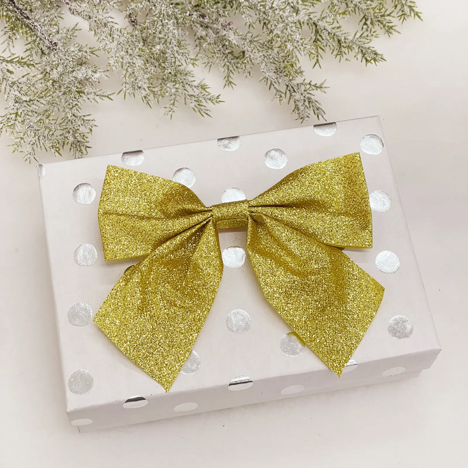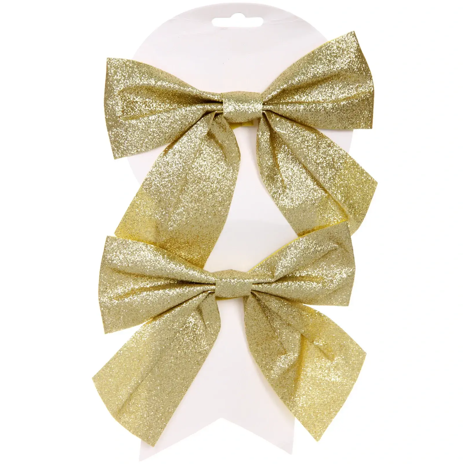 Эти великолепные золотые банты станут идеальным украшением для вашей ёлки или подарков. Их блестящая поверхность и элегантный дизайн добавят нотку роскоши в ваш новогодний декор. Каждый бант размером 15х15 см выполнен из качественного текстиля, что обеспечивает долговечность и привлекательный внешний вид.