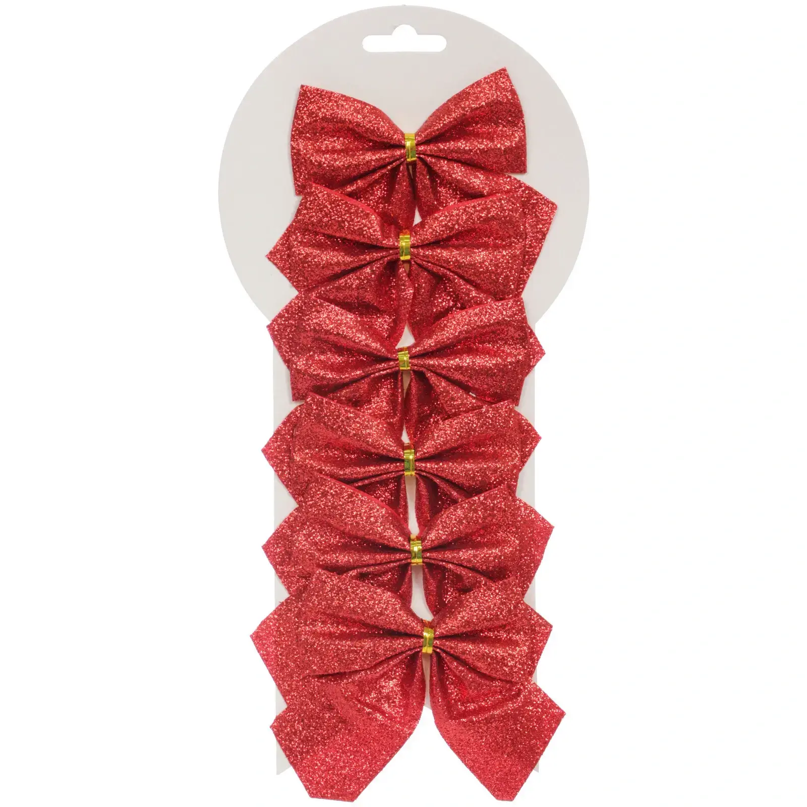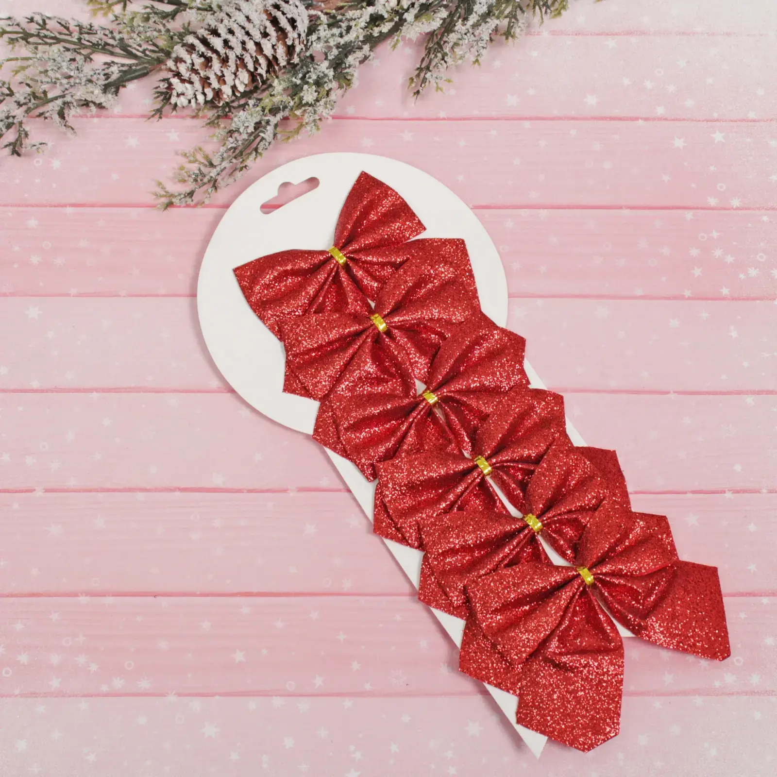 Размер каждого банта составляет 8,5*9 см, что делает их заметными, но не слишком громоздкими. Красный цвет бантиков отлично сочетается с традиционными новогодними оттенками, а золотистая завязка придаёт дополнительный шарм. Эти банты изготовлены из текстиля, что обеспечивает их долговечность и возможность многократного использования.