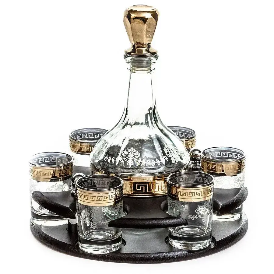 Набор «Барокко» создан для тех, кто ценит роскошь в деталях. Стеклянный графин с золотистым колпаком и стопки с декоративным орнаментом превратят подачу напитков в настоящий ритуал. Комплект включает стильную стойку для удобного хранения — идеальное решение для домашнего бара или праздничного стола.