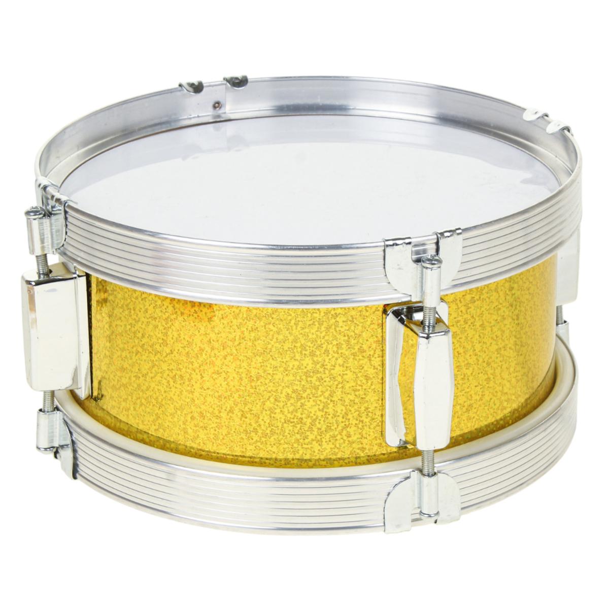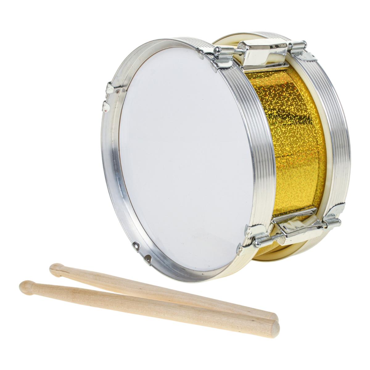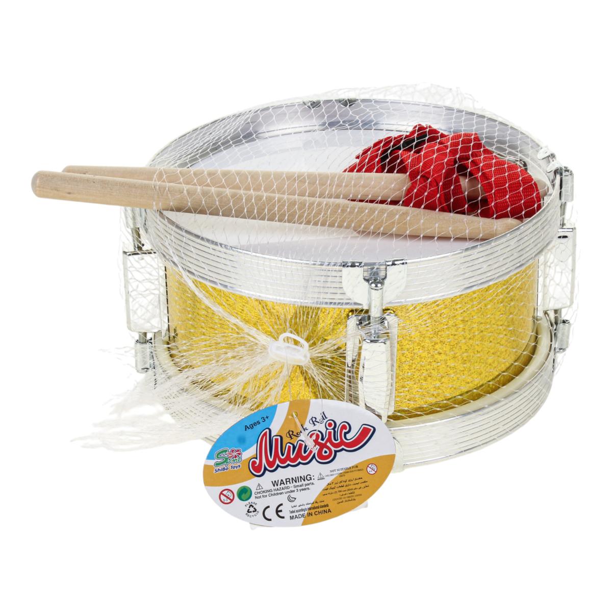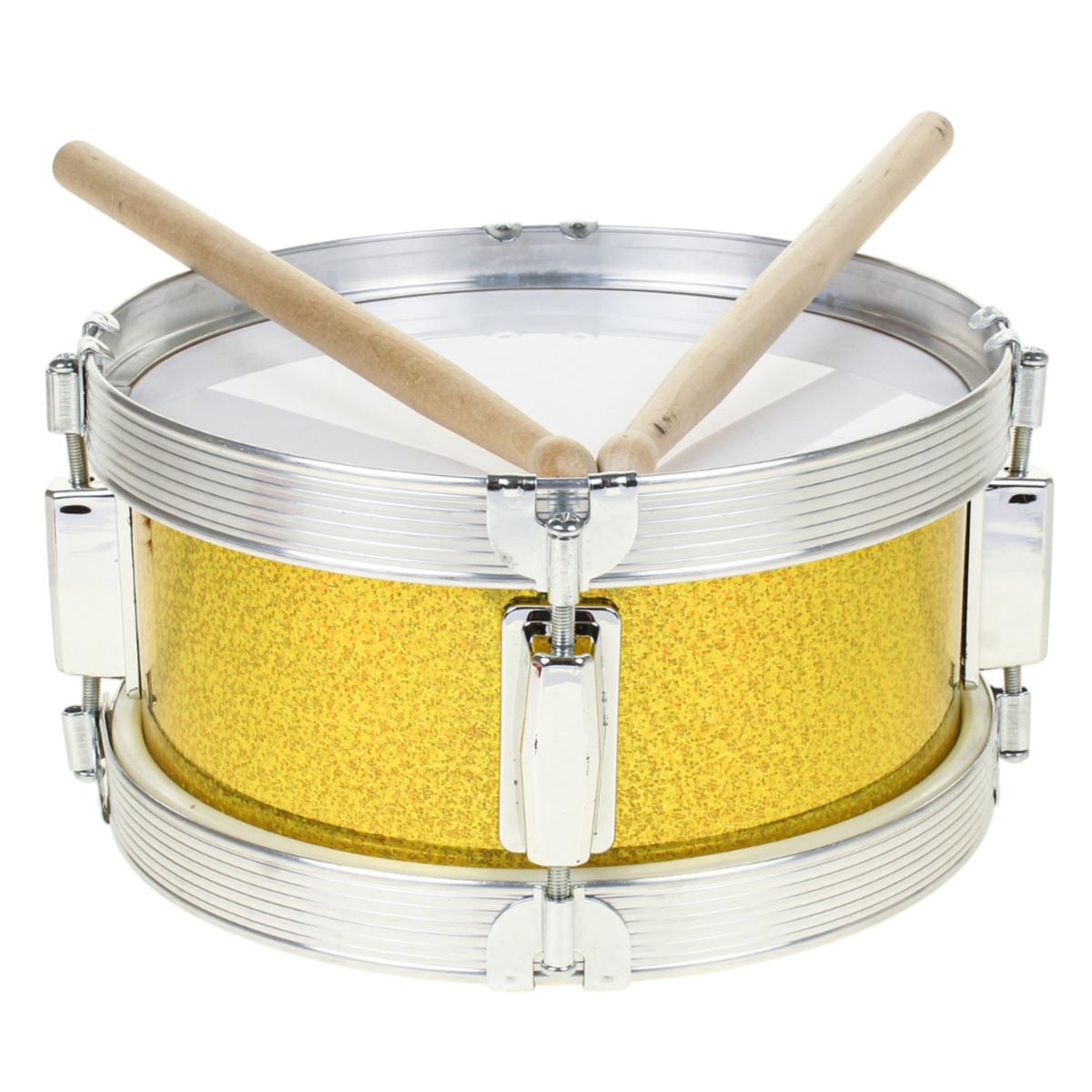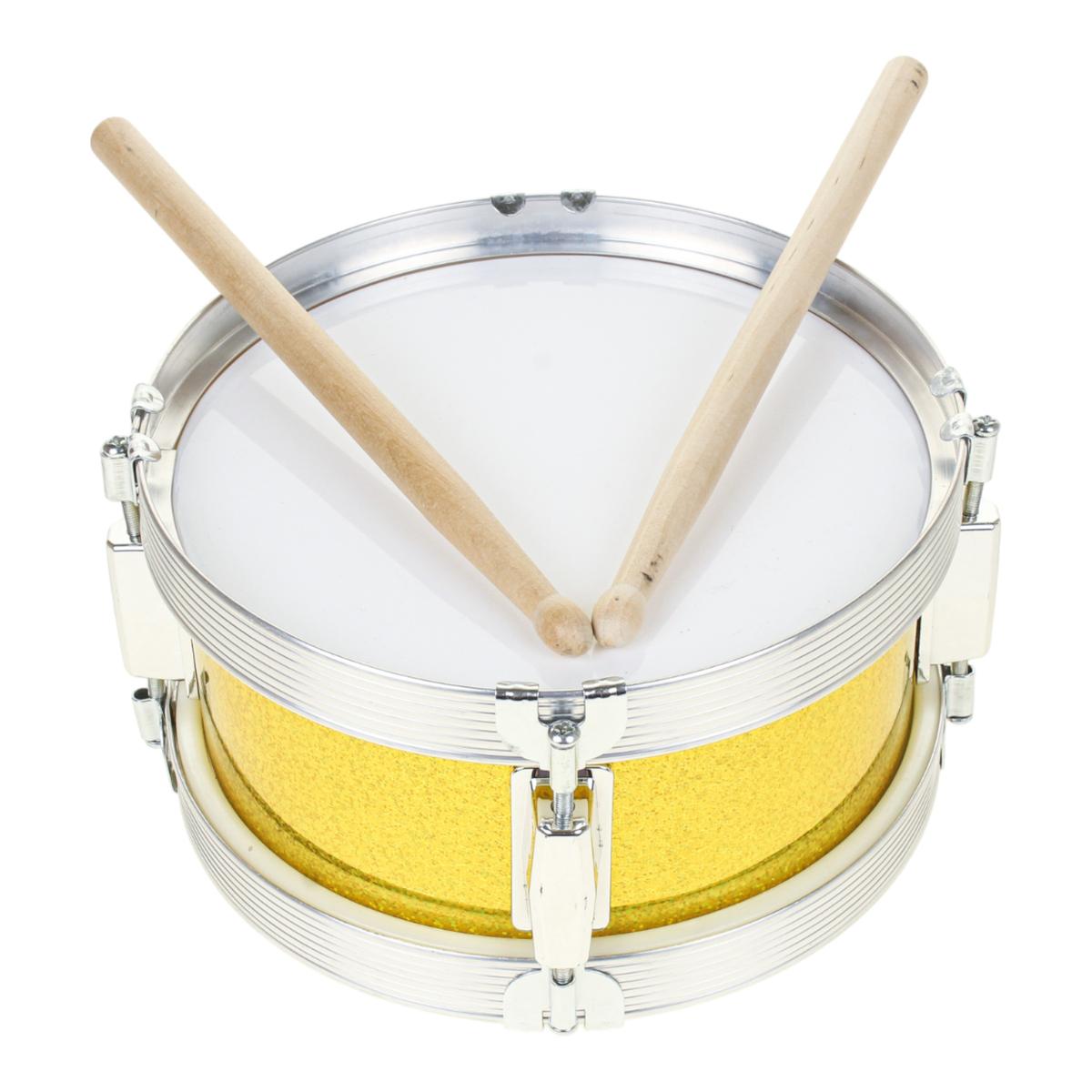 Корпус выполнен в золотистом цвете с блестящим покрытием, мембрана — белая, ободы и крепежные элементы — металлические серебристые. Палочки изготовлены из светлого дерева и удобно лежат в детской руке. Прочная конструкция рассчитана на активную игру.