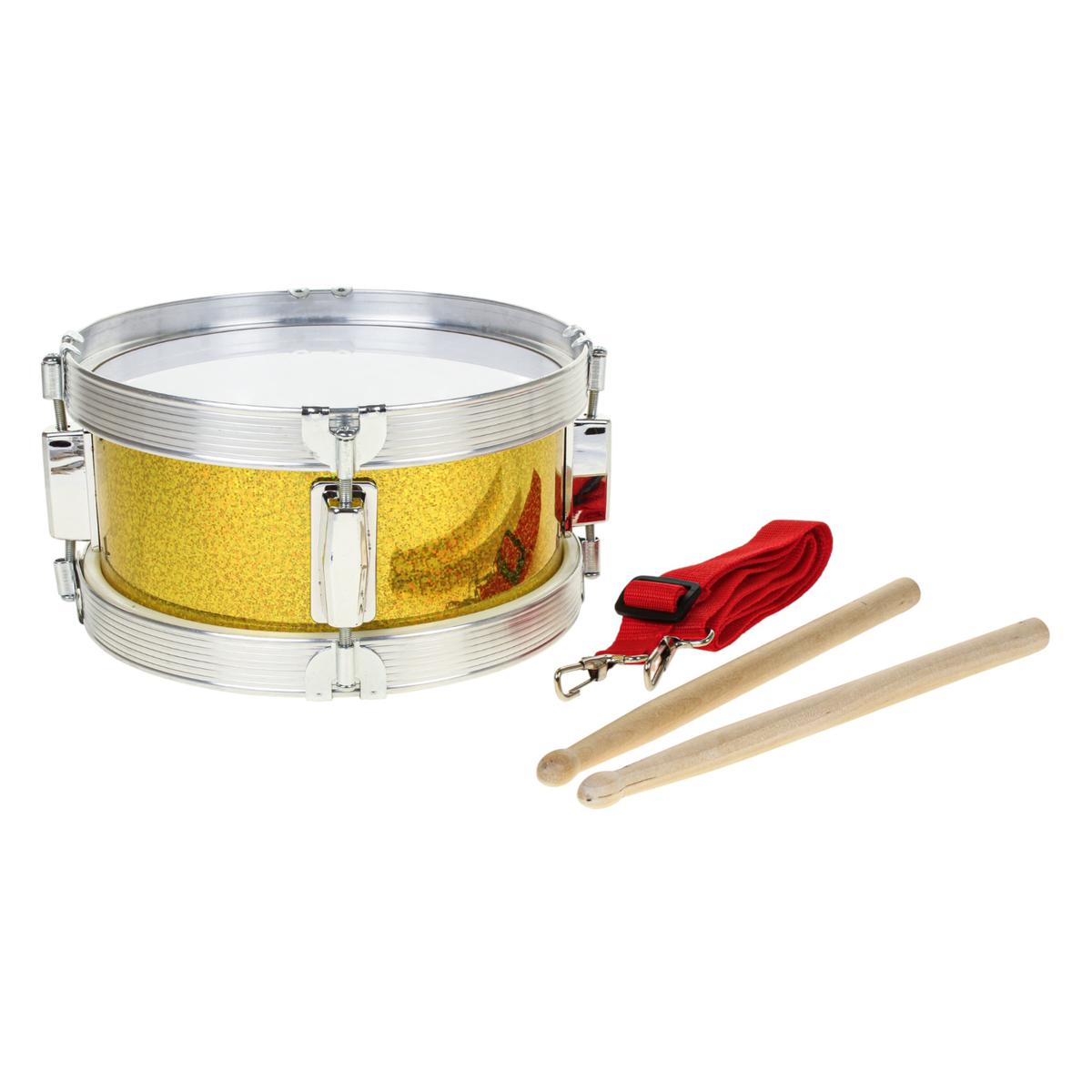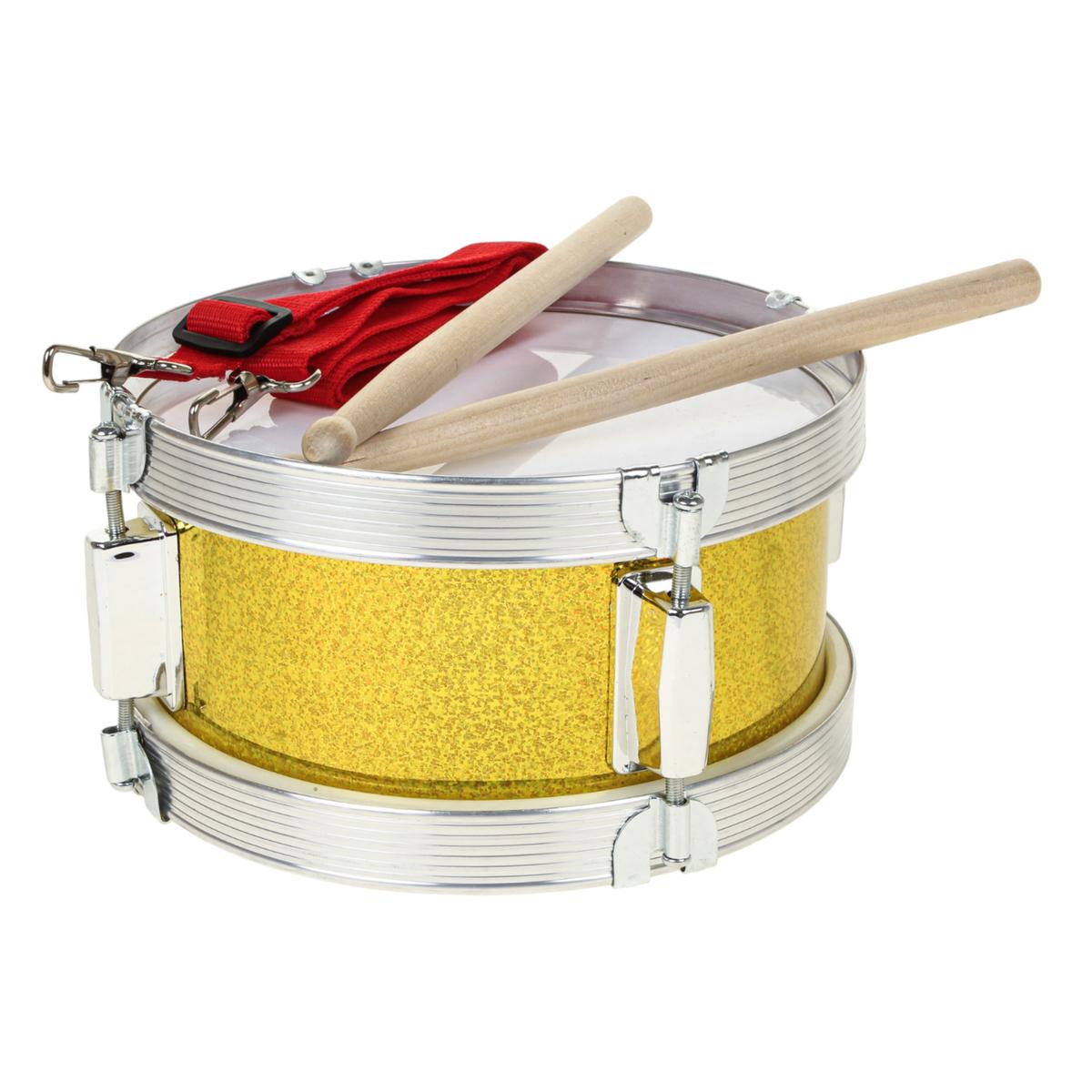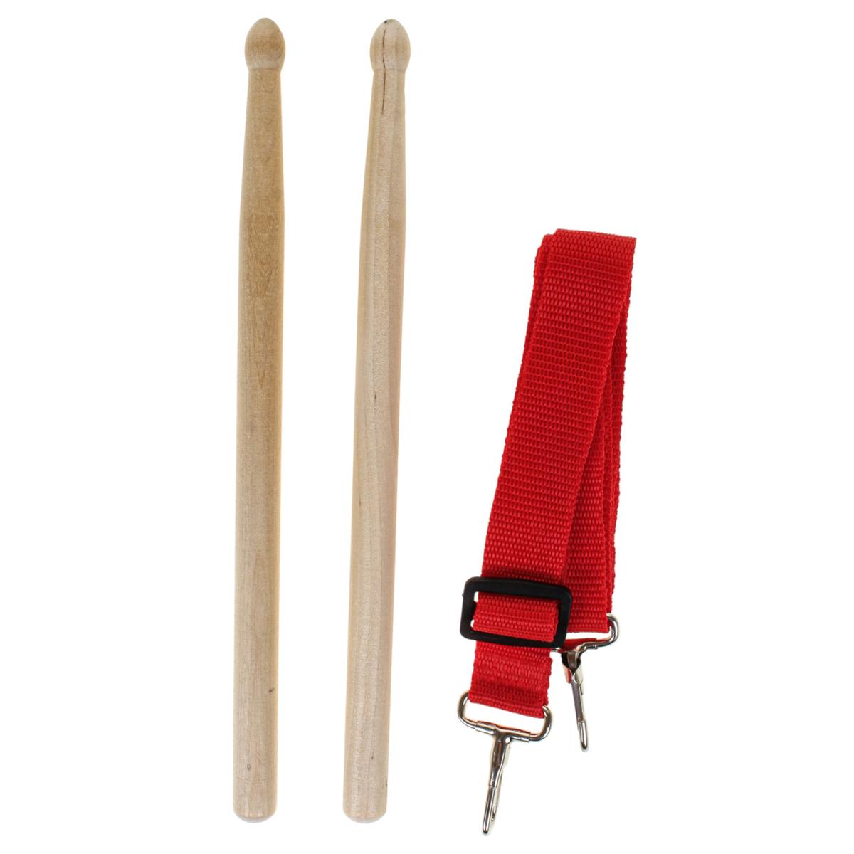 Барабан подходит для домашних концертов, игр в детском саду и творческих занятий. В комплект входят две деревянные палочки и текстильный ремень с регулировкой длины и металлическими карабинами. Ремень позволяет носить инструмент на плече, освобождая руки и делая игру более комфортной.