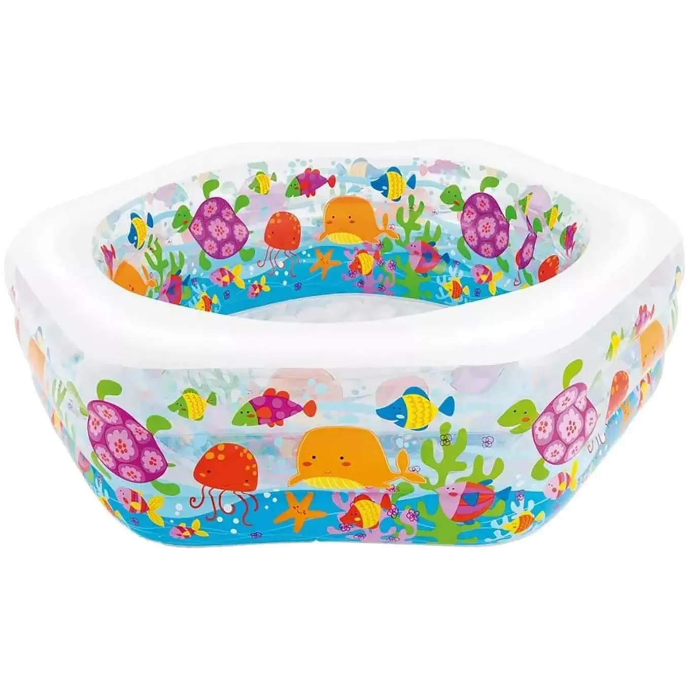 Шестигранная форма с белым кантом обеспечивает устойчивость, а прозрачные стенки позволяют родителям контролировать игры детей. Объём 541 литр даёт достаточно пространства для подвижных игр, при этом бассейн легко наполняется стандартным садовым шлангом.