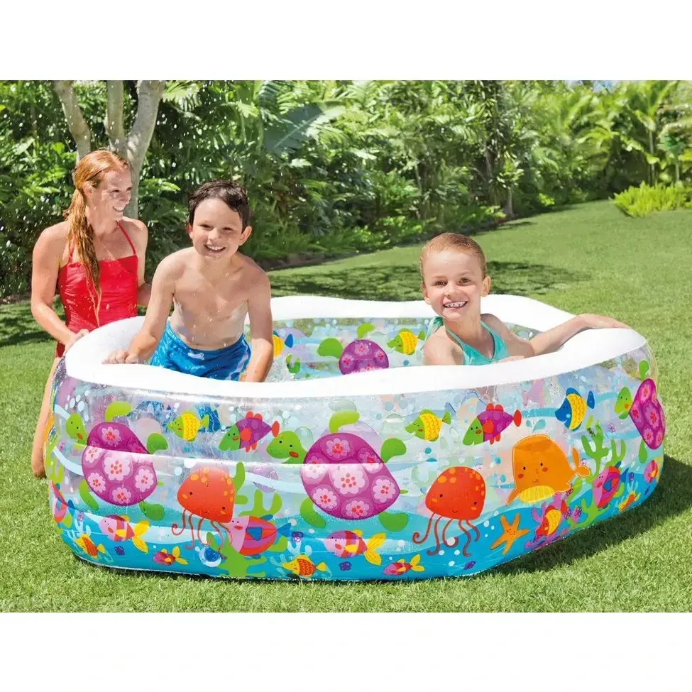 Подарите детям незабываемое лето с бассейном, где прозрачные стенки превращают купание в увлекательную игру! Мягкий надувной пол защищает от неровностей поверхности, а красочные рисунки морских обитателей создают атмосферу подводного путешествия.