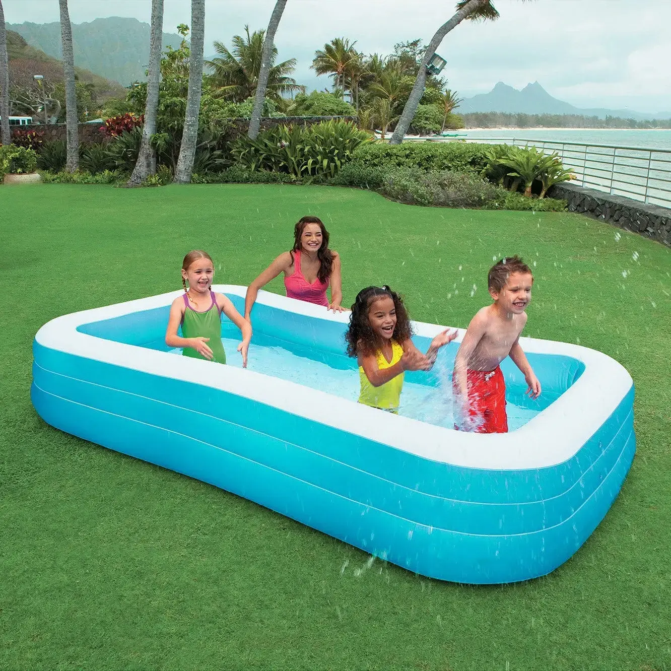 Идеальное место для летних забав! Комфортный надувной бассейн прямоугольной формы (305x183x56 см) подарит вашей семье и детям радость домашних водных развлечений в самый разгар зноя. Мягкие безопасные бортики, просторная купальная зона и прочный материал делают его отличным выбором для родителей, ищущих сочетание уюта и уверенности в безопасности дома.