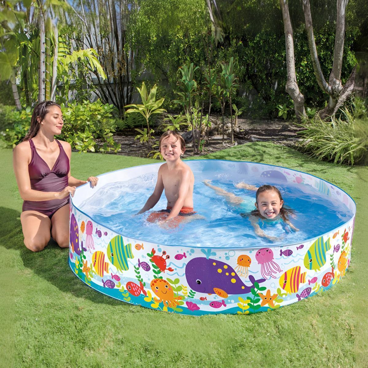 Бассейн легко устанавливается на ровной поверхности во дворе или на даче. Рекомендуемый объем воды - 958 литров, что создает комфортную глубину 37 см для безопасного купания. Подходит для детей от 3 лет.
