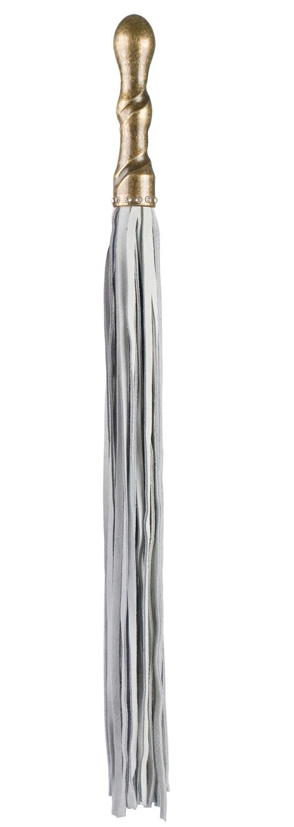 Рукоять длиной 12 см имеет эргономичную волнообразную форму, которая обеспечивает надежный и комфортный хват. Медное покрытие придает ей благородный блеск и солидный вес, а 12 кристаллов, инкрустированных по окружности, добавляют изделию шика и индивидуальности. Плетеная часть изготовлена из узких полос натуральной кожи белого цвета, что гарантирует ее прочность, гибкость и характерные тактильные свойства.