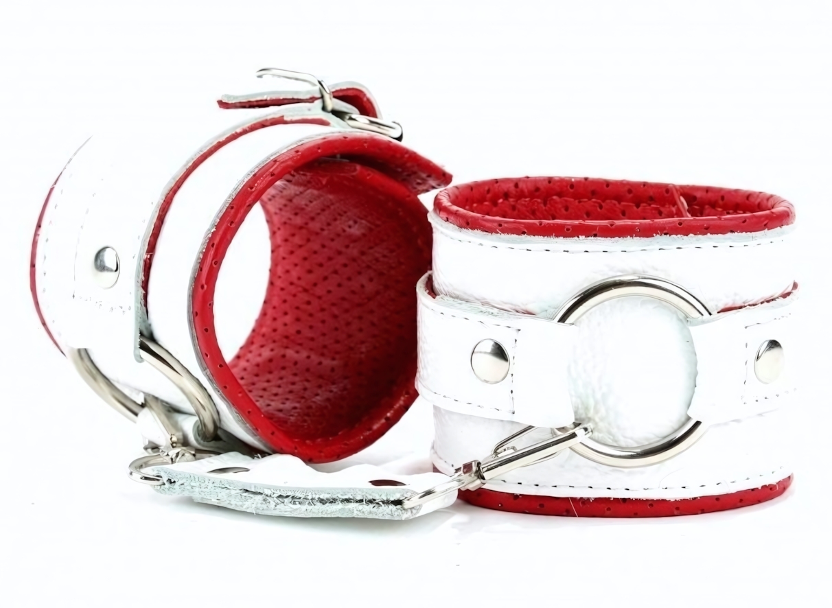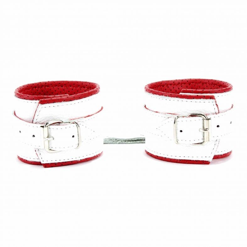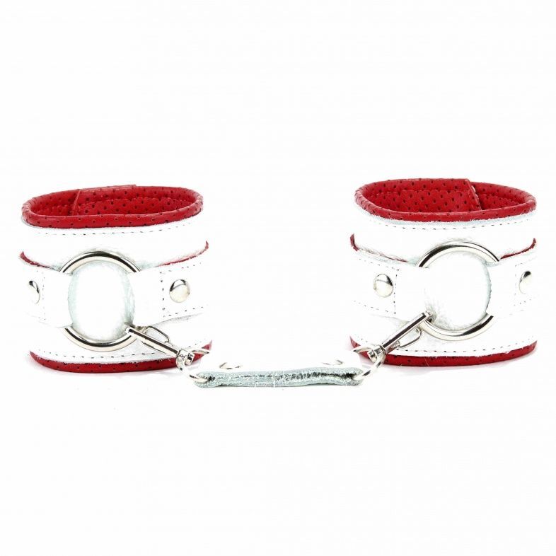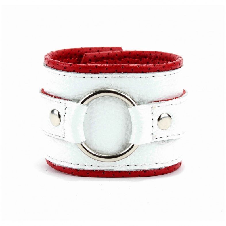 Наручники кожаные с регулируемым размером, бело-красные, металлические заклепки, 16-25 см, кольцо 4 см