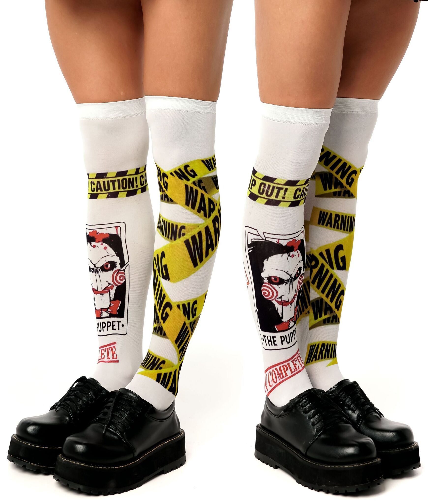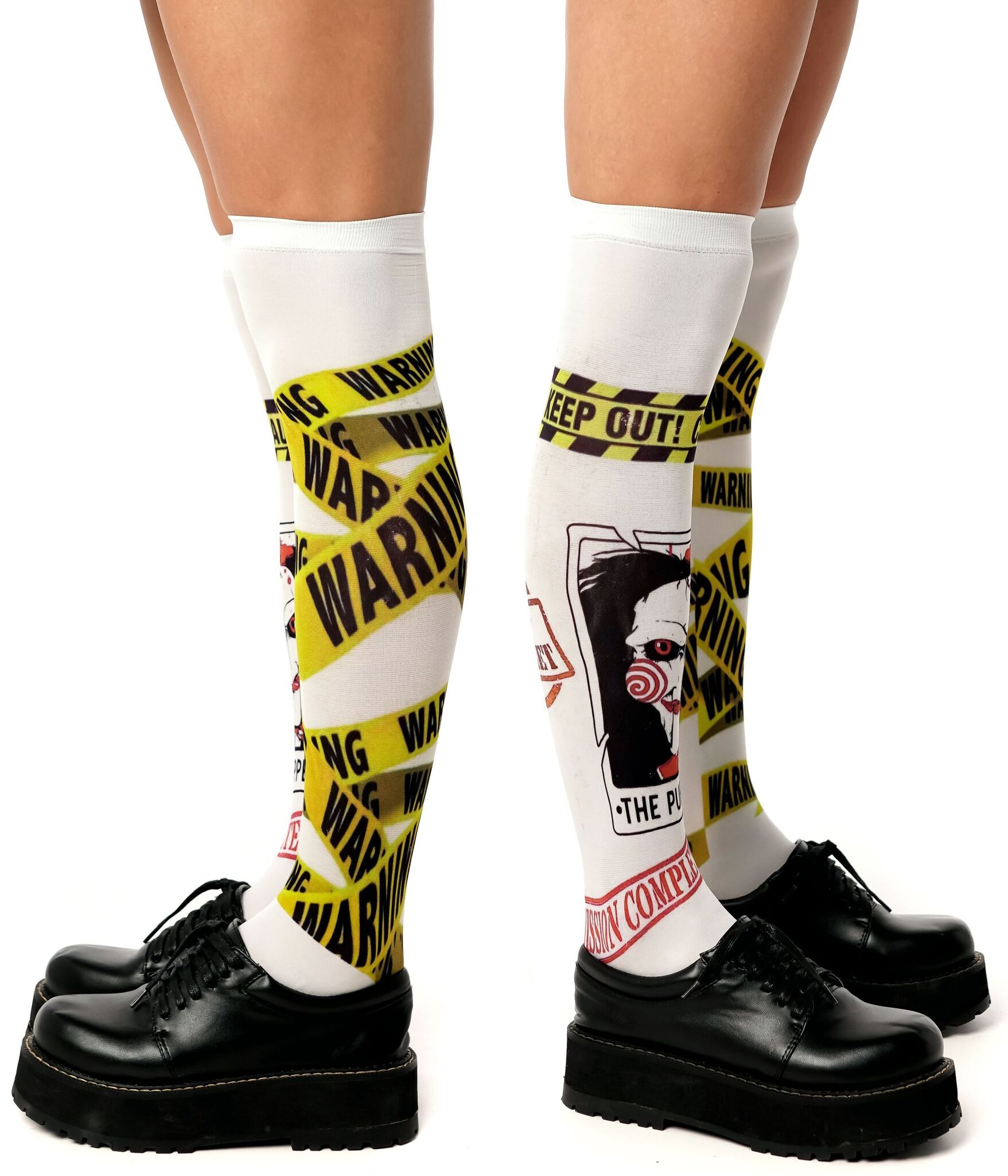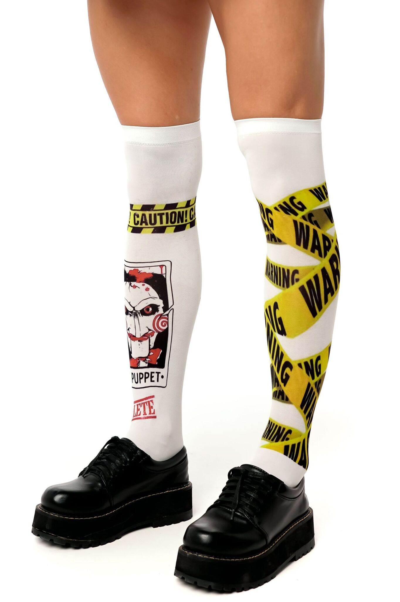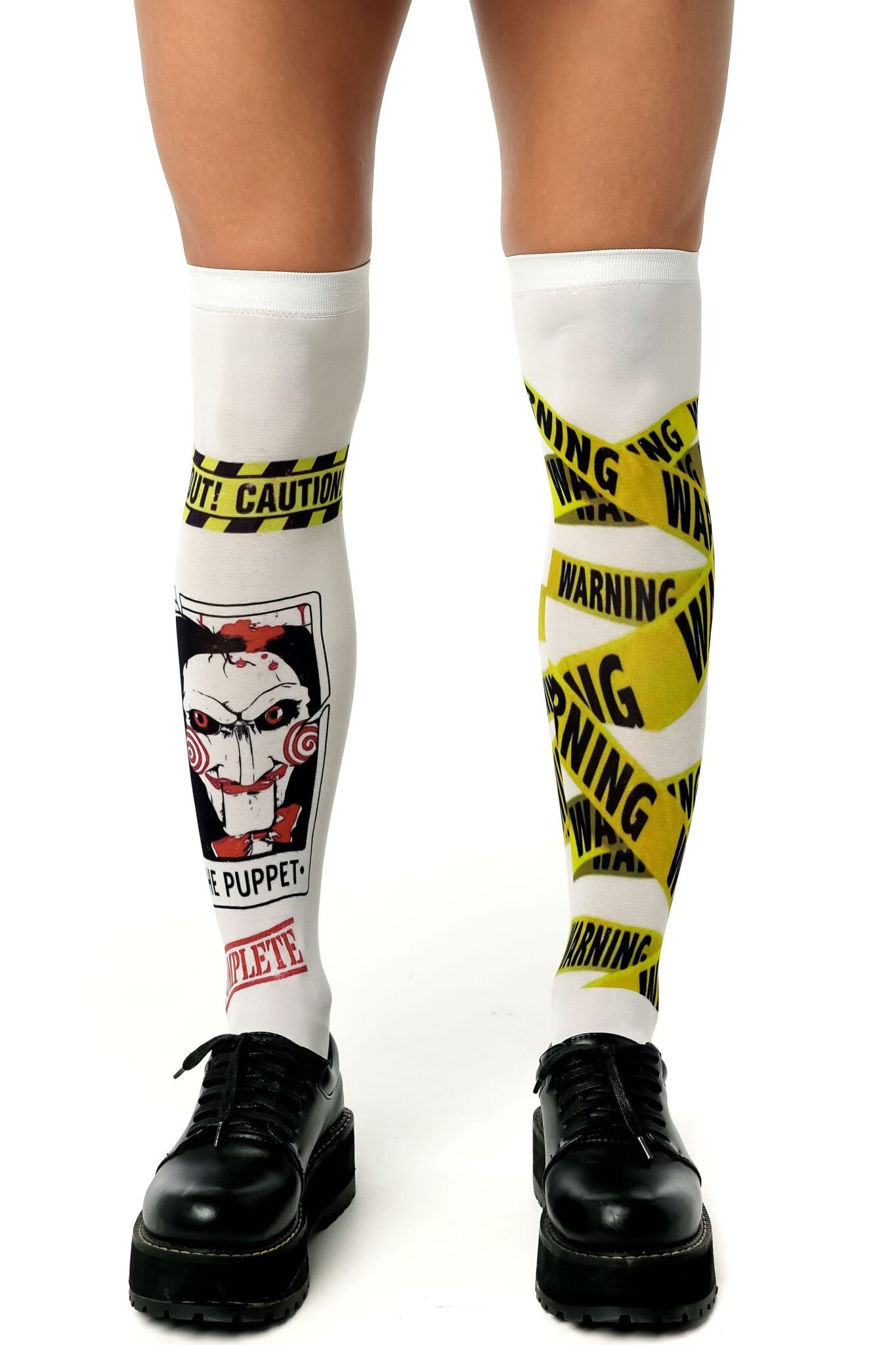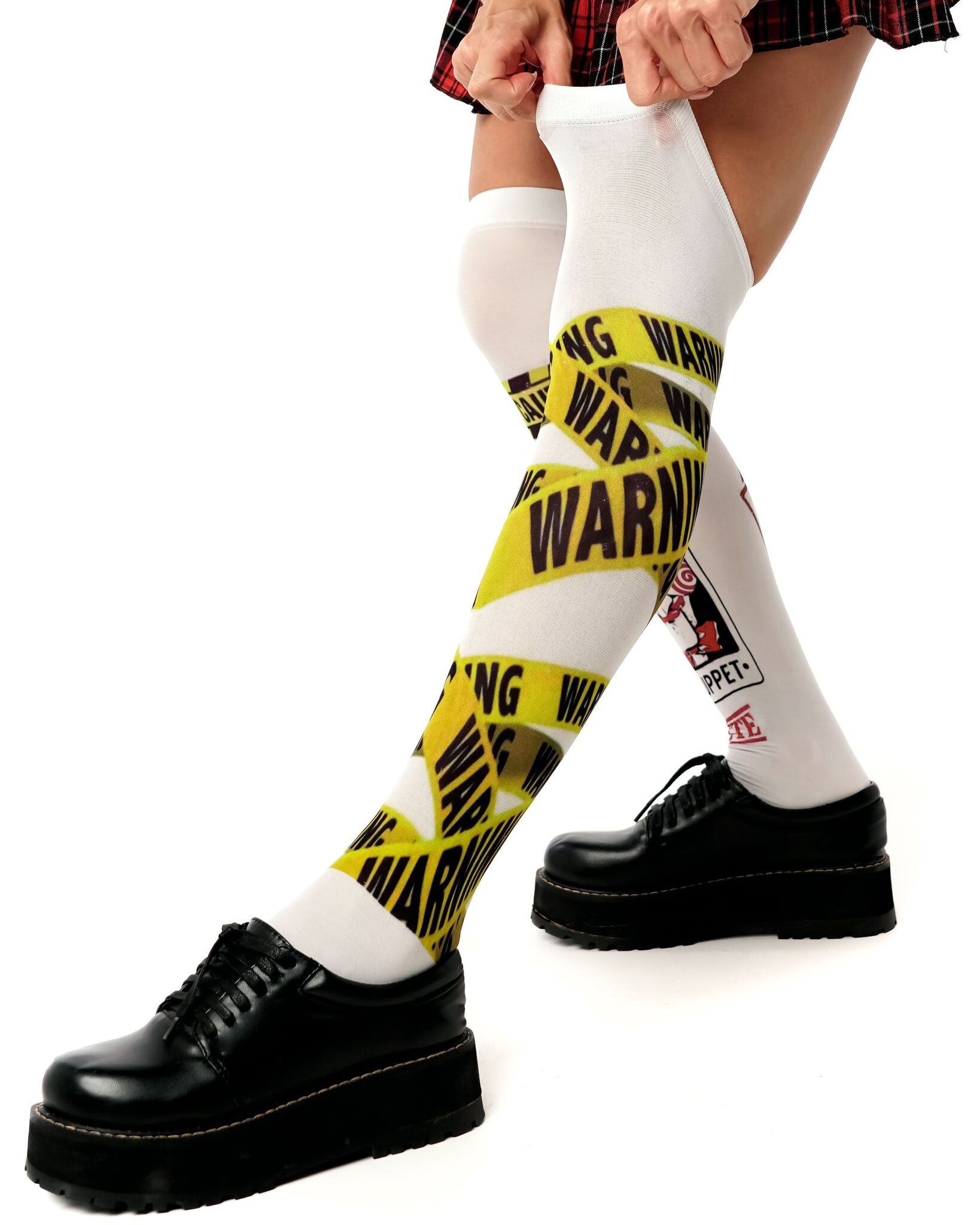 Создайте неповторимый look с гольфами, вдохновленными культовым стилем. Броский дизайн с элементами предупреждающей ленты и символикой "Puppet" привлечет все взгляды.