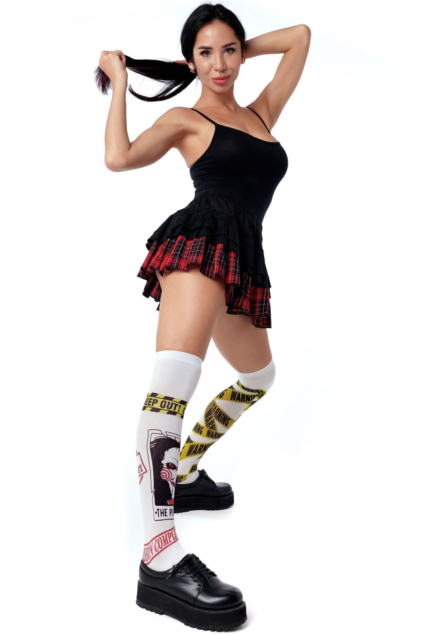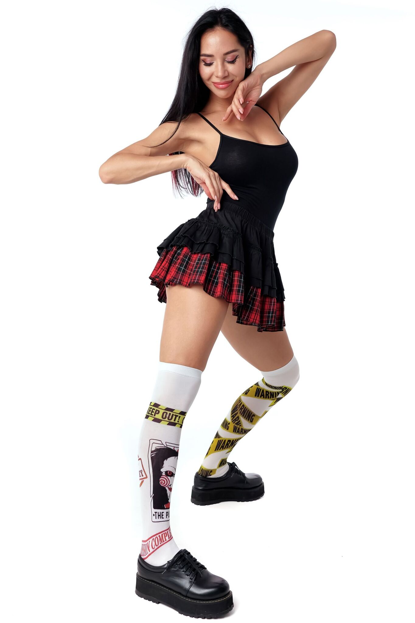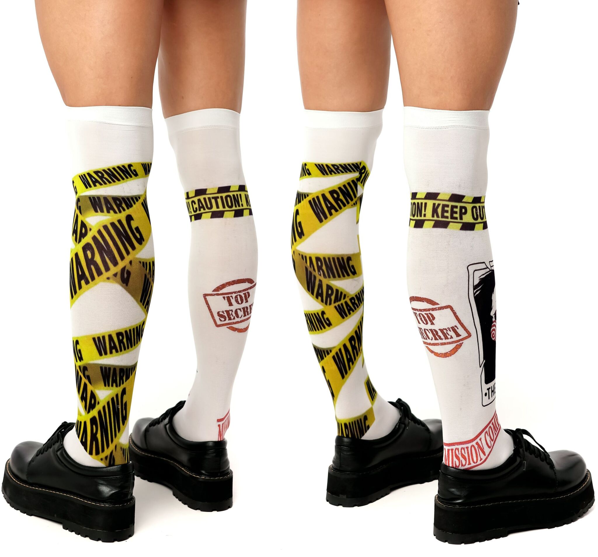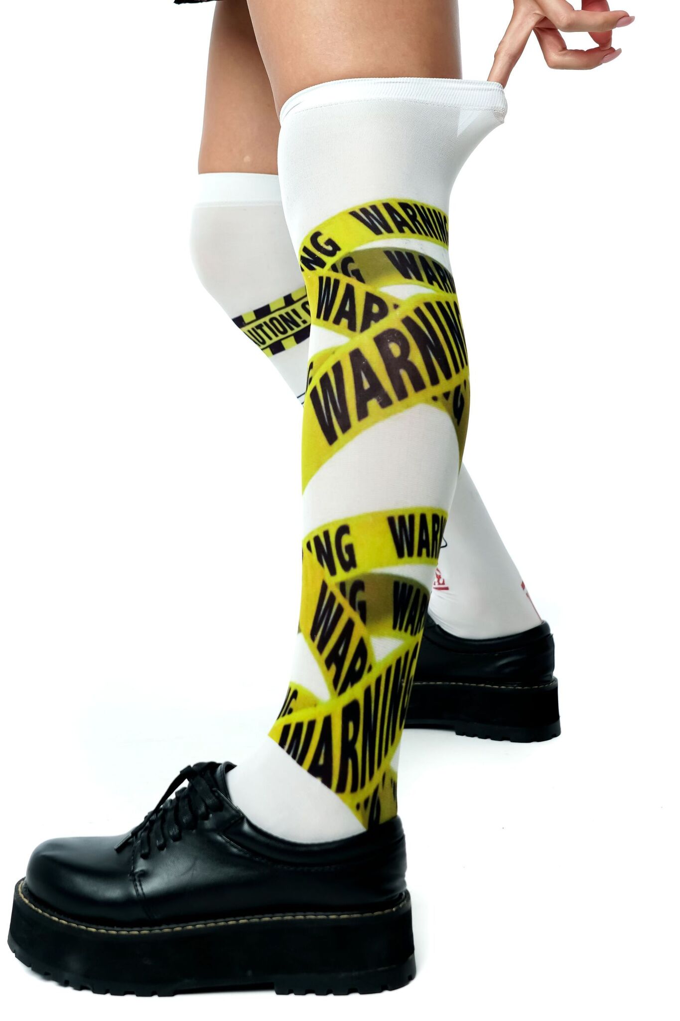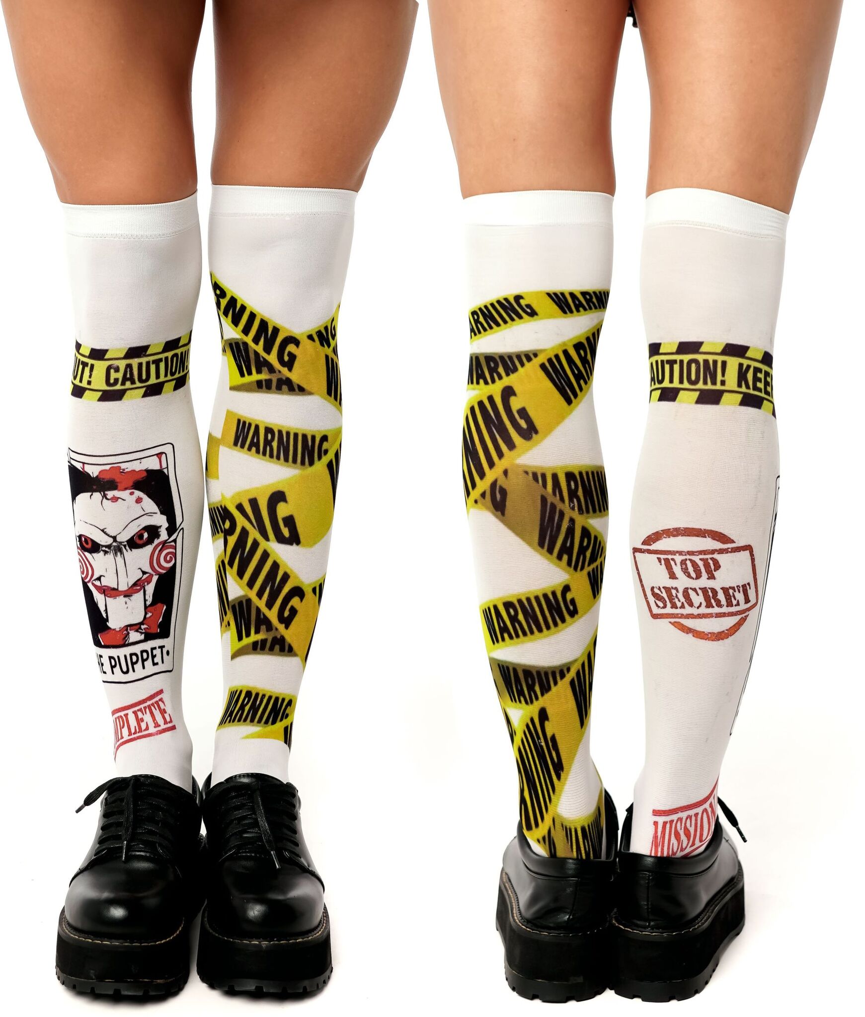 Создайте неповторимый look с гольфами, вдохновленными культовым стилем. Броский дизайн с элементами предупреждающей ленты и символикой "Puppet" привлечет все взгляды.