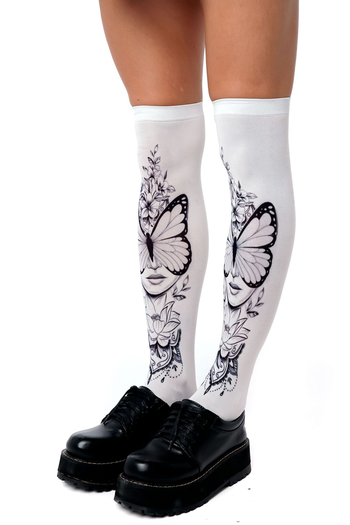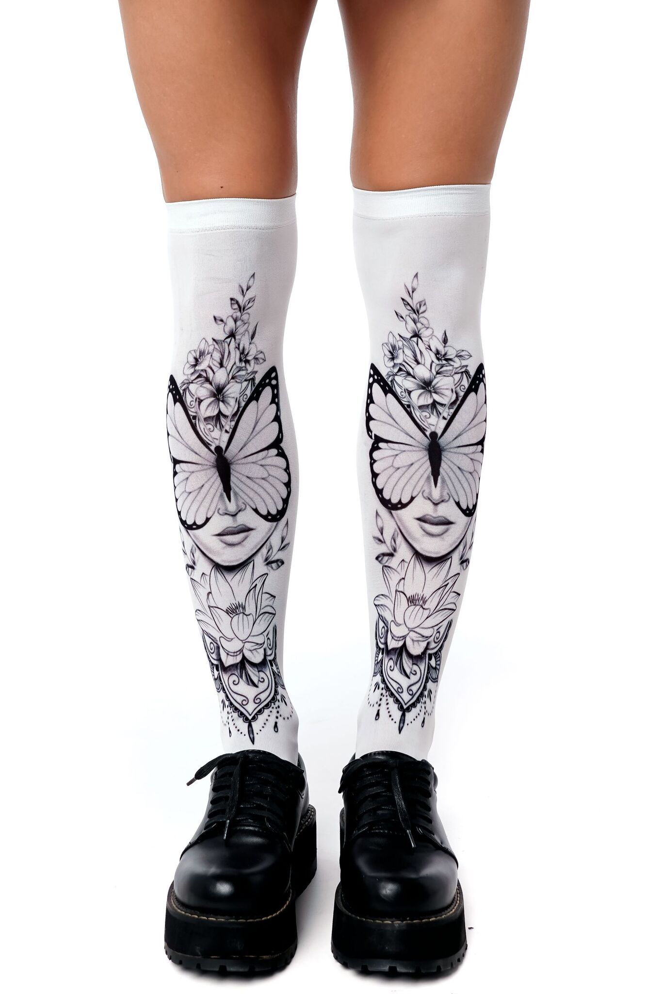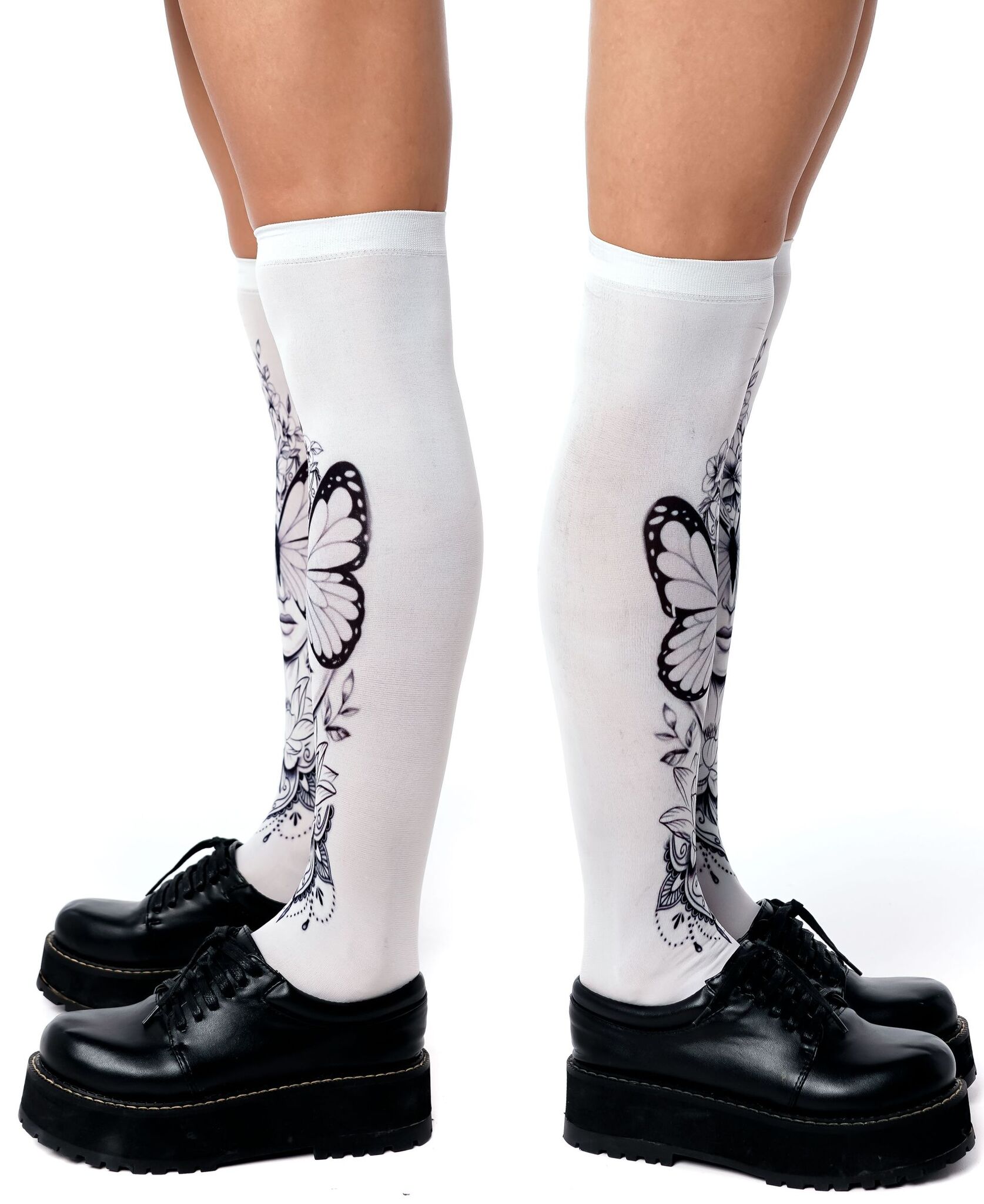 Создайте неповторимый стиль с белыми гольфами, украшенными изящным принтом в виде бабочки и цветочных элементов. Эти гольфы станут идеальным завершением вашего образа, добавляя нотку игривости и элегантности.