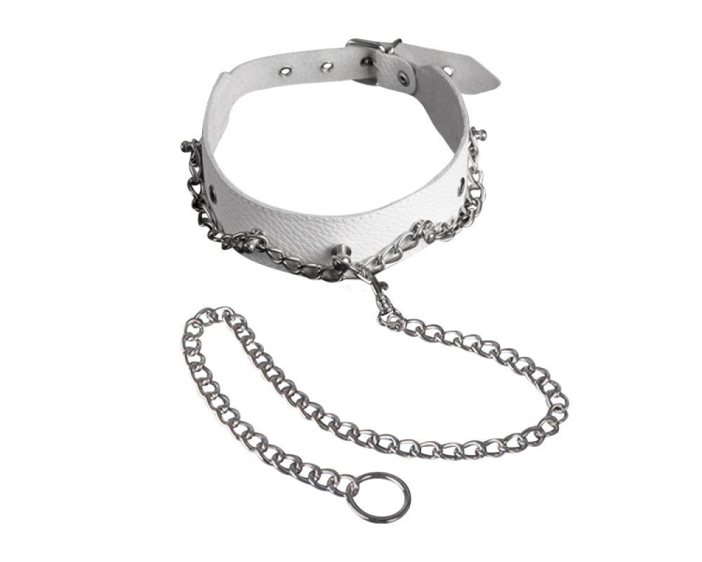 Цвет: белый. Материал: натуральная кожа. Длина цепочки: 50 см. Ширина ошейника: 5 см. Этот аксессуар станет отличным дополнением к вашему гардеробу и поможет создать незабываемые моменты.