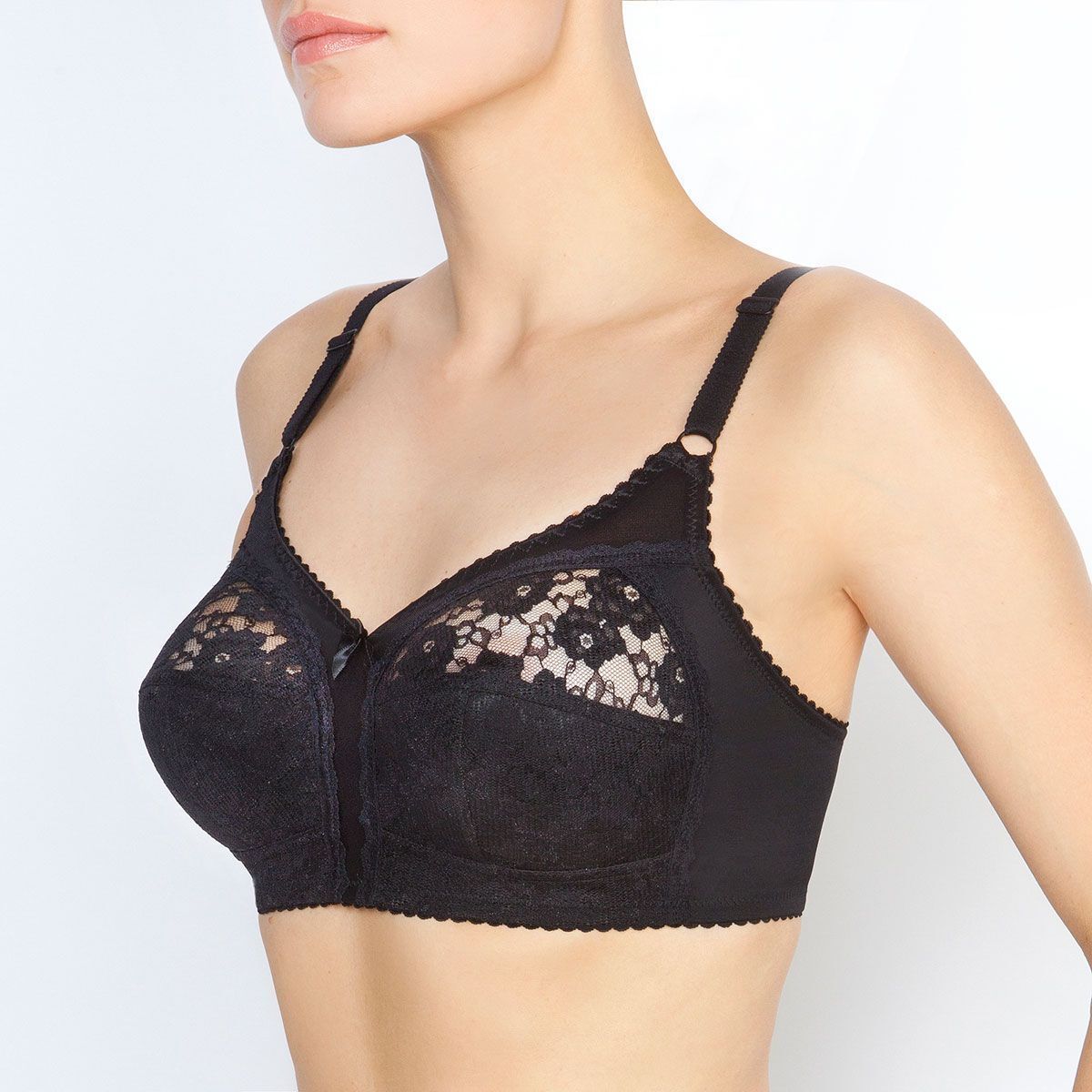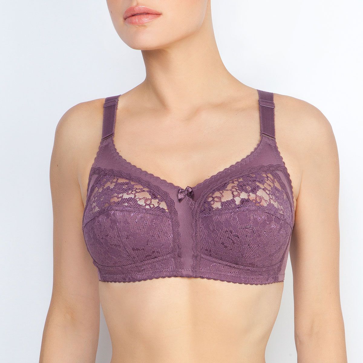 Бескаркасный бюстгальтер с мягкими кружевными чашками специально разработан для женщин с большой полнотной группой. Уникальная ламинация хлопком обеспечивает стабильность и мягкое прилегание, что особенно важно при активном образе жизни.