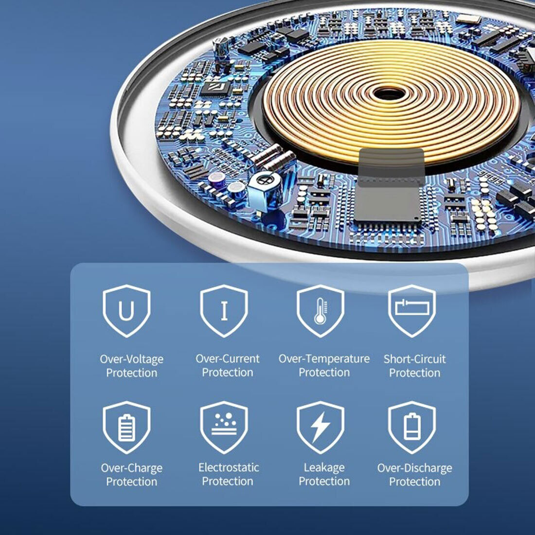 Компактные размеры (60 мм в диаметре) и вес 45 г позволяют брать зарядку в поездки. Встроенные чипы контроля мощности предотвращают повреждение аккумулятора вашего устройства.