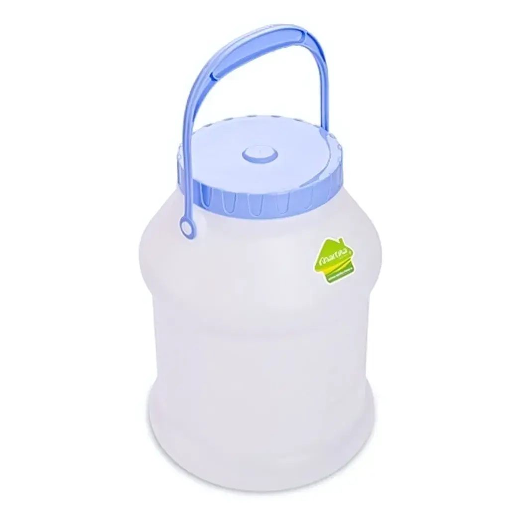 Бидон выполнен в белом цвете с голубой крышкой и ручкой, что придает ему стильный и современный вид. Его округлая форма с широкой основой обеспечивает устойчивость, а сужающаяся к верху конструкция облегчает хранение. Объем 5 литров позволяет хранить достаточное количество продуктов, что делает его идеальным для семейного использования.