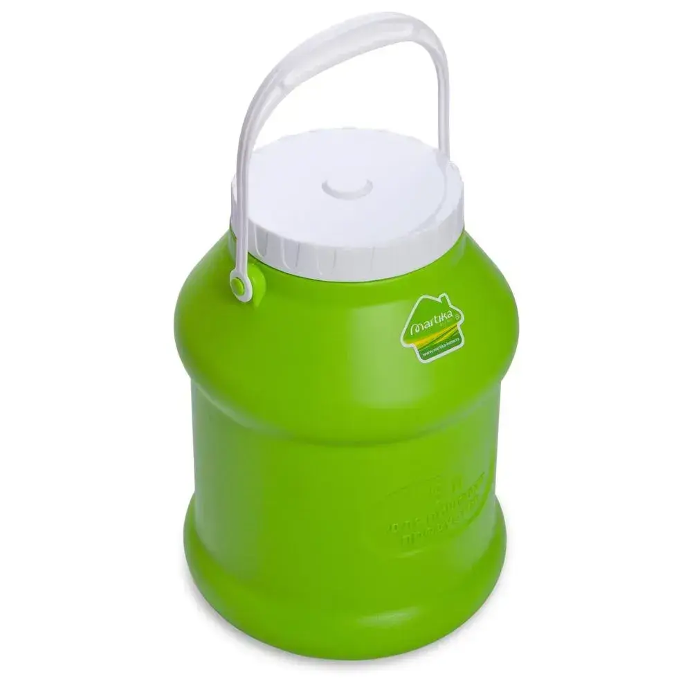 Объём каждой ёмкости — 5 литров. Цвет — насыщенный зелёный. Материал — экологичный полипропилен, разрешённый для контакта с пищевыми продуктами. Округлая форма корпуса обеспечивает устойчивость и удобство хранения.
