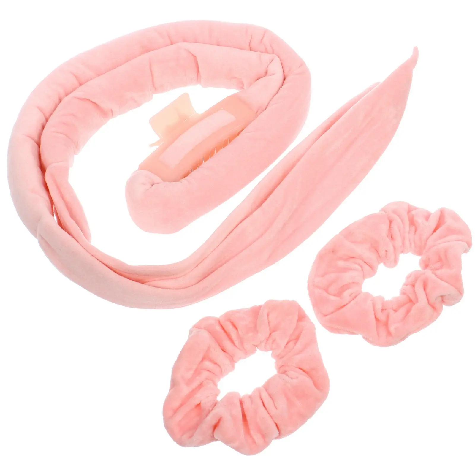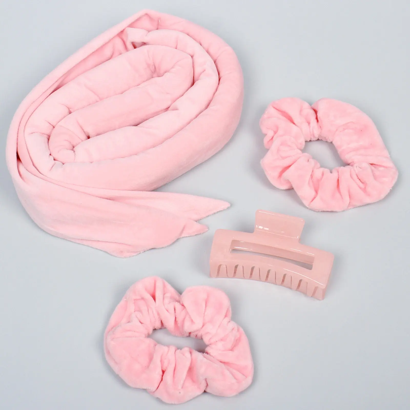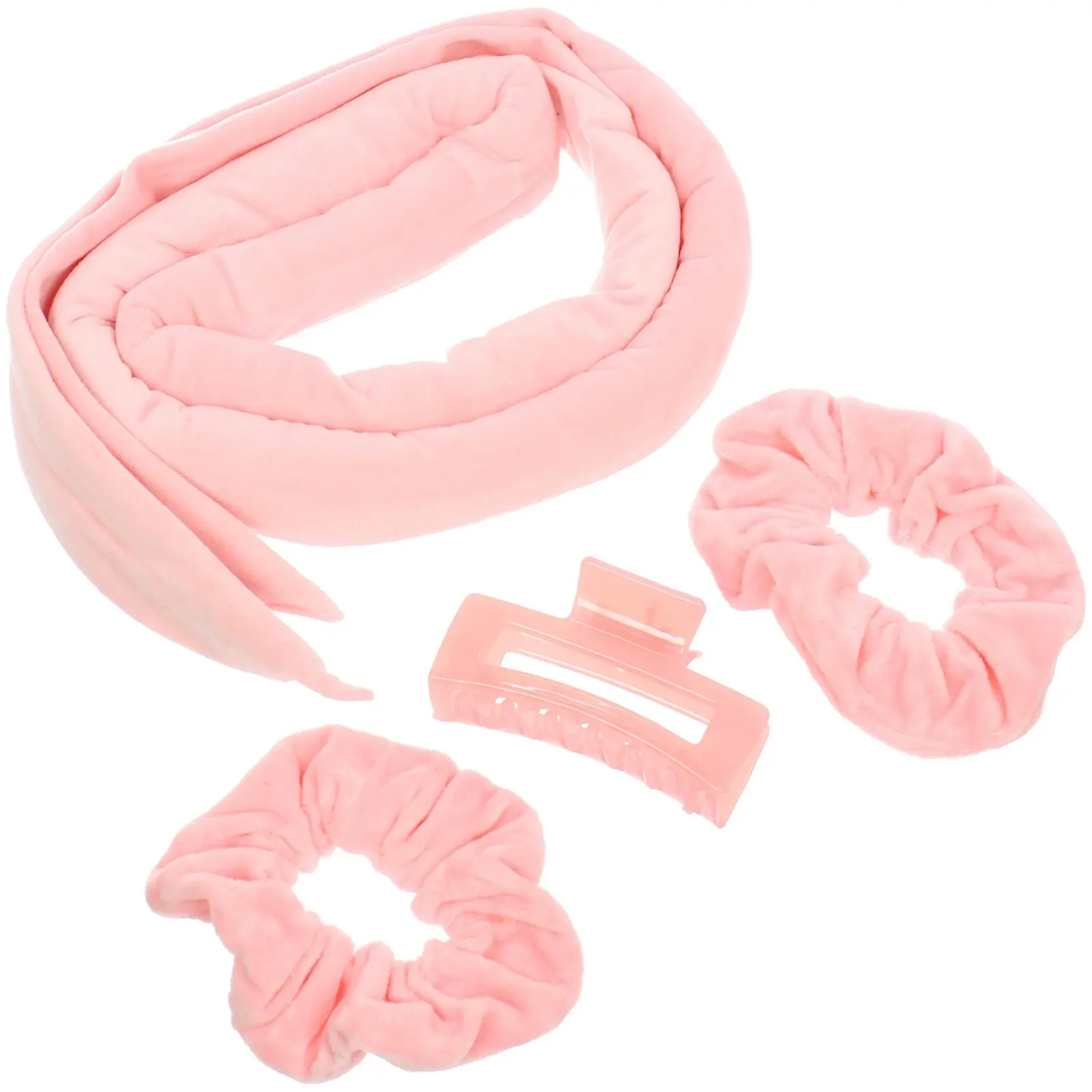 В набор входят: бигуди-лента, две резинки с рюшами и заколка-краб. Все элементы выполнены в нежно-розовом цвете из качественных материалов (текстиль, пластик, металл).