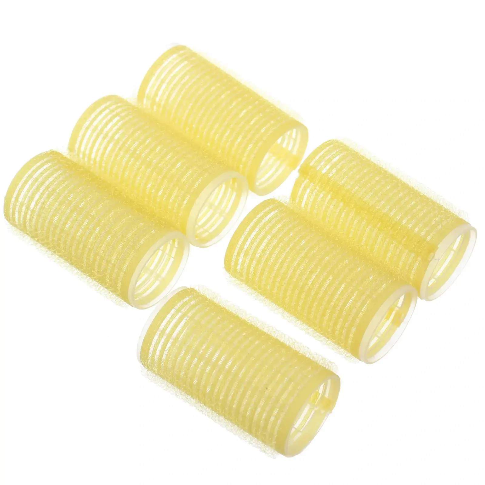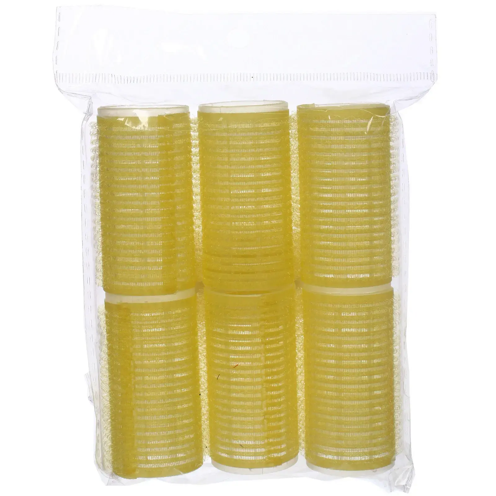 Каждый набор включает 6 бигуди светло-желтого цвета диаметром 3 см. Они изготовлены из качественного пластика с ворсистым покрытием, что обеспечивает надежное удержание волос. Бигуди имеют стандартный размер, что делает их удобными для использования в домашних условиях или в салоне красоты.
