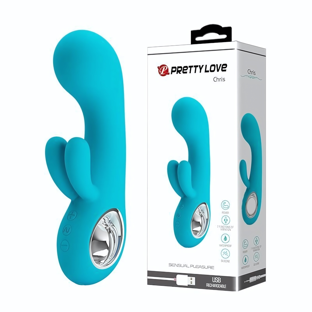 Вибратор Chris с клиторальным стимулятором «ушки зайчика», силикон, 7 режимов, USB-зарядка, 15,4 см, бирюзовый