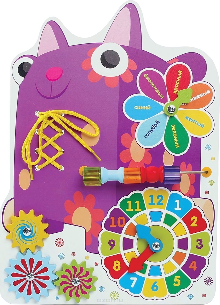 Бизиборд развивающий «Кошечка Мяу», деревянный, с часами, шнуровкой, 6 элементов