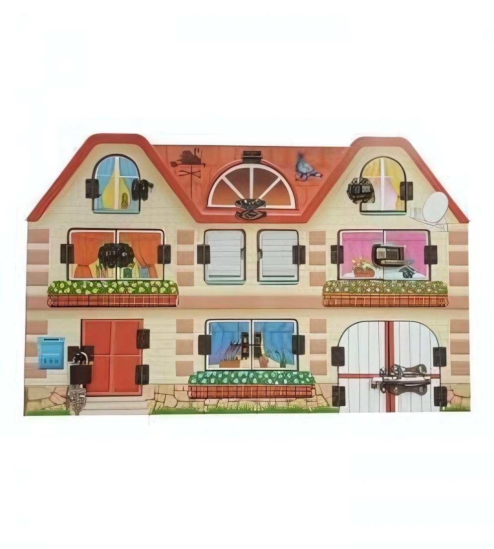 Бизиборд выполнен в виде уютного домика, где окна и двери закрываются на разные задвижки. Открывая их, малыш сможет заглянуть внутрь и увидеть, как живет семья: мама готовит обед, папа работает в гараже, а дедушка читает газету. Вкладыши с домочадцами можно вынимать и ставить в разные места, что развивает креативность и воображение. Играя с бизибордом, ребенок сможет не только развлекаться, но и учиться составлять небольшие рассказы о жизни семьи, что значительно обогатит его словарный запас.