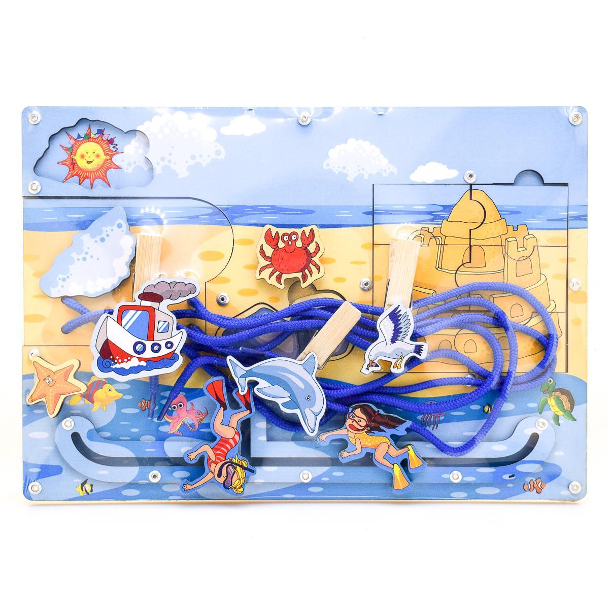 Бизиборд «Пляж» деревянный, морская тематика, элементы пазла и шнуровки, 30х25см, безопасные края