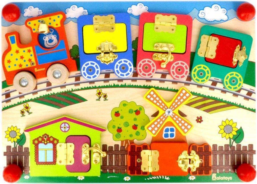 Бизиборд развивающий «Вагончики», 35х25 см, дерево, металл, дверцы, замки, колеса