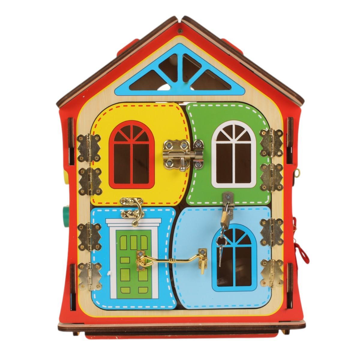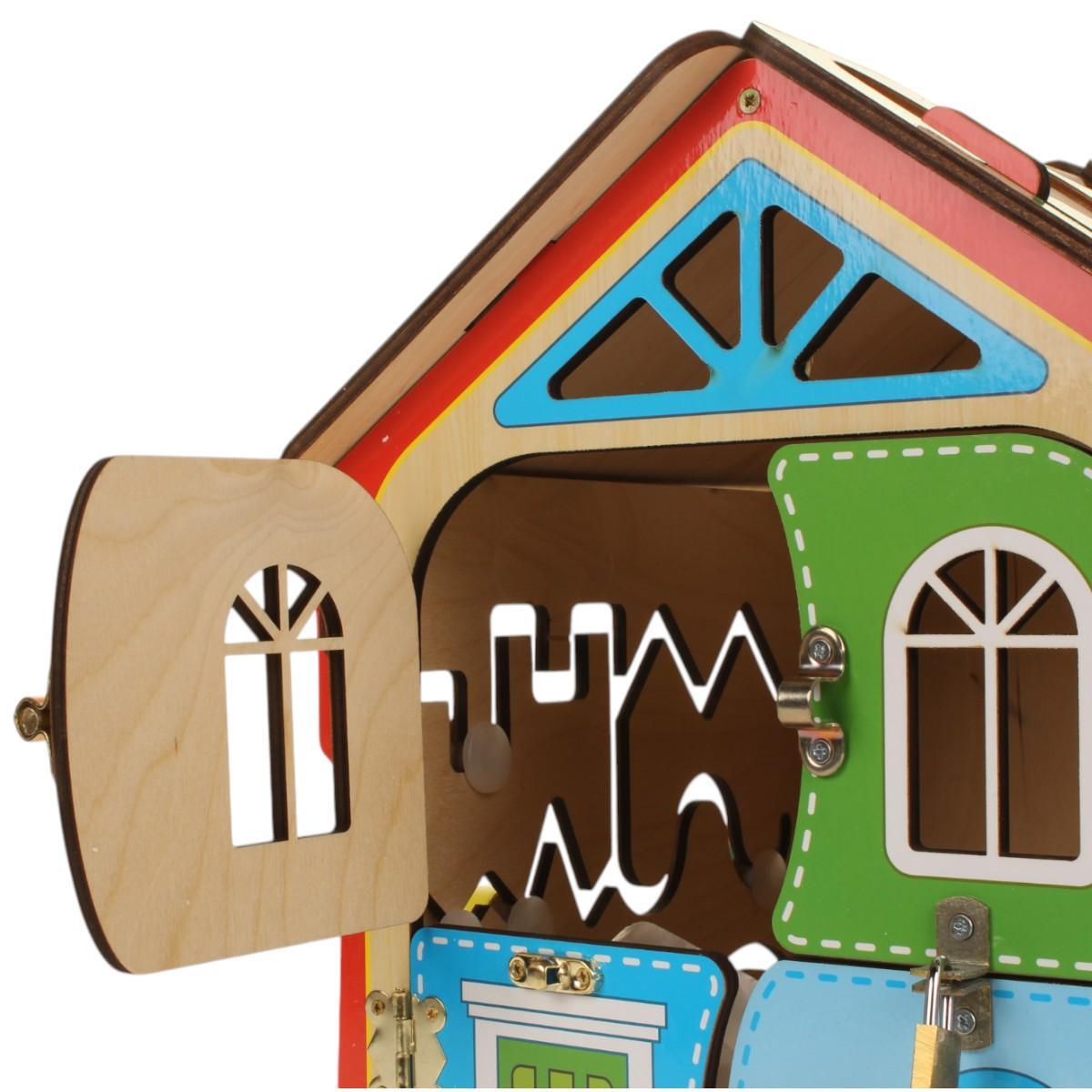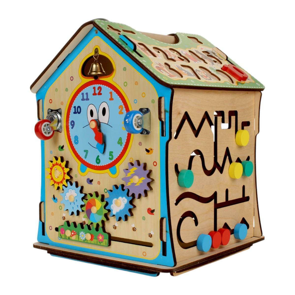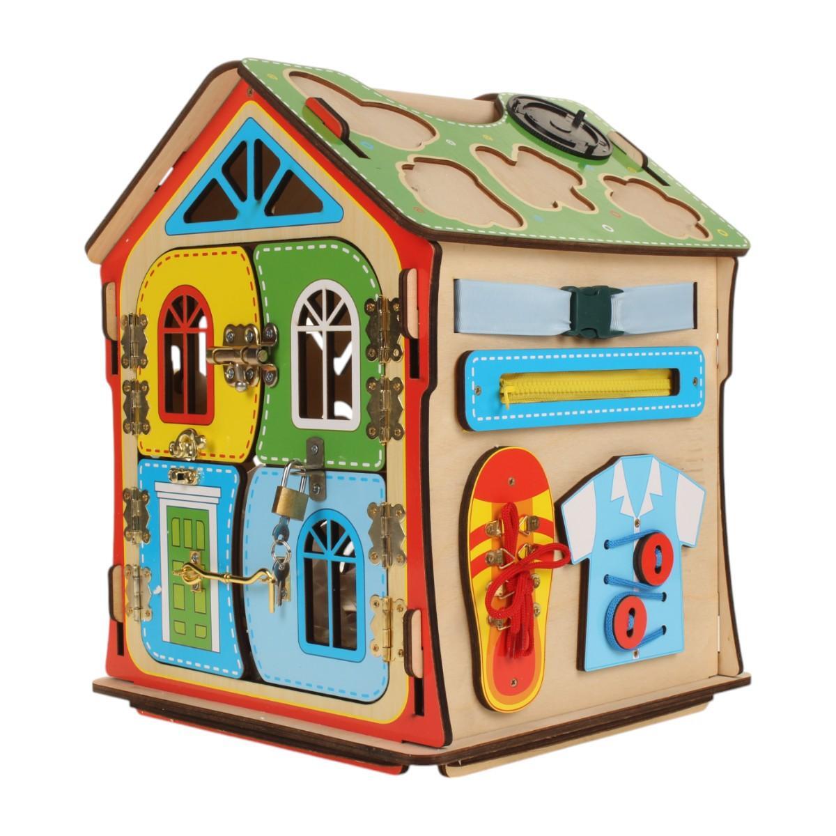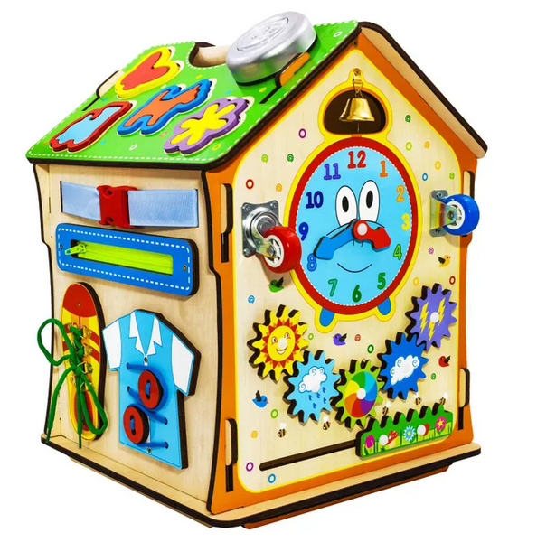 Бизидом подходит для детей от 1 года и старше. Он может использоваться как для игры, так и для хранения игрушек, благодаря открывающимся дверцам. На стенах домика расположены лабиринты, колесики, шестеренки, циферблат со стрелками, колокольчик и замки, что делает его идеальным инструментом для обучения и развлечения.