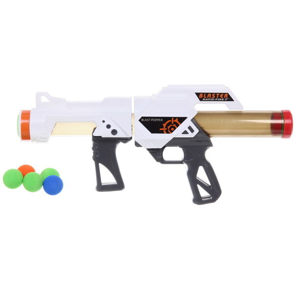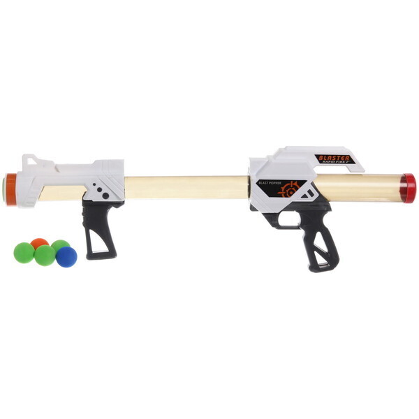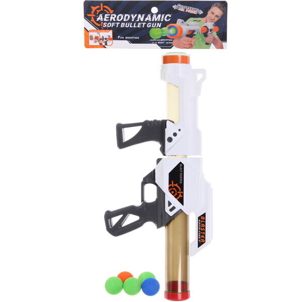 Размеры бластера составляют 47 см в длину и 20 см в ширину, что делает его удобным для детских рук. Бластер выполнен в стильном белом цвете с черными и оранжевыми акцентами, что придает ему современный вид. Прозрачная трубка добавляет элемент визуального интереса, позволяя наблюдать за процессом игры.