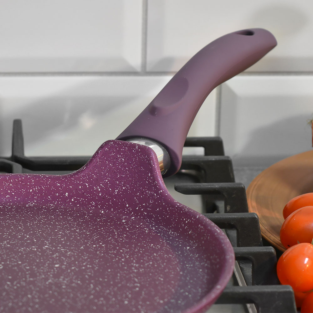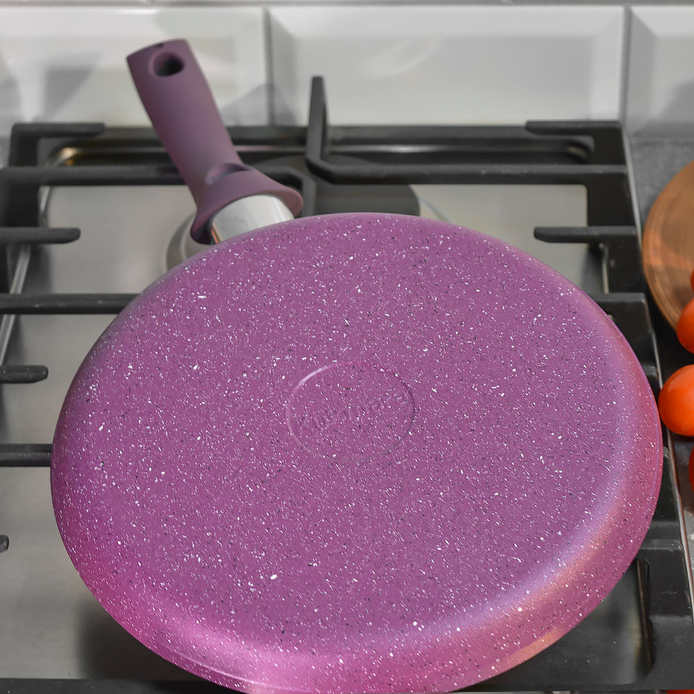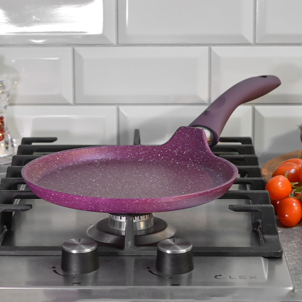 Пурпурный цвет с декоративными вкраплениями придаёт посуде современный акцент и гармонично вписывается в интерьер кухни. Блинница подходит не только для классических блинов, но и для панкейков, омлетов и тонких лепешек. Практичный выбор для ежедневного использования дома.